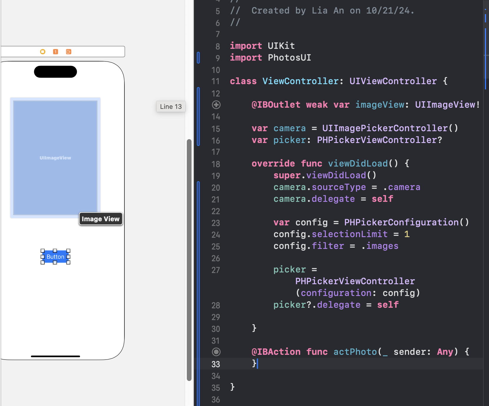 그다음, 이미지뷰와 버튼 객체를 IBOutlet, IBAction으로 각각 연결해준다.