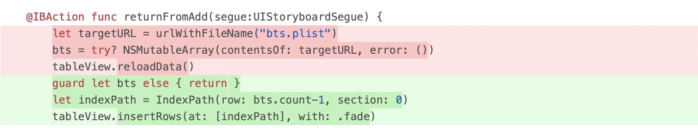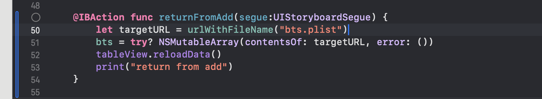 따라서, 방금 만든 세그 되돌아가기 함수 returnFromAdd()에다가 indexPath 변수를 새로 선언해서 받아준다.