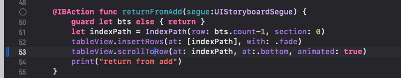 그리고 리스트를 추가했을 때 추가한 위치로 스크롤이 내려가는걸 구현하기 위해 MainTableViewController.swift의 returnFromAdd()에 아래와 같은 코드 한줄을 추가해준다.