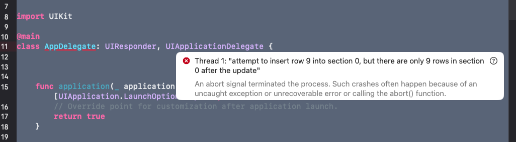 이렇게 앱을 실행해보면, 아래와 같이 앱이 터지게 된다.