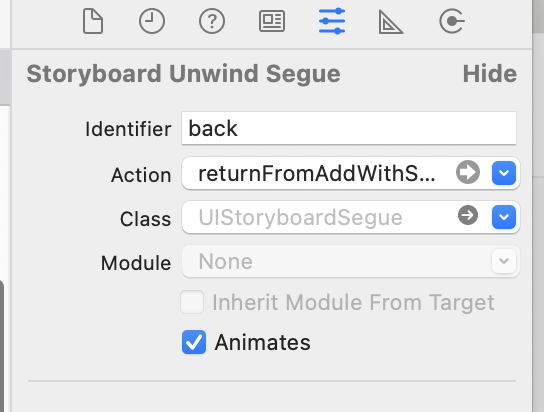 이제 이걸 클릭해서 인스펙터 윈도우를 보면, Storyboard Unwind Segue 가 있고, 이것의 identifier를 "back"으로 설정해준다.