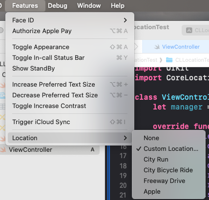 일단 테스트를 위해 위에까지 코드를 입력해주고, 실행을 해준다. 참고로, 시뮬에서 Features > Location을 들어가면 아래와 같은 여러 모드가 있다.
