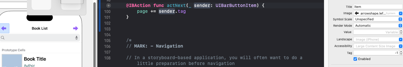 왼쪽 버튼도 actNext() 기능에 연동시키고, 왼쪽 버튼은 tag값을 -1, 오른쪽은 +1로 주고 page += sender.tag로 주면 똑같이 동작을 한다!