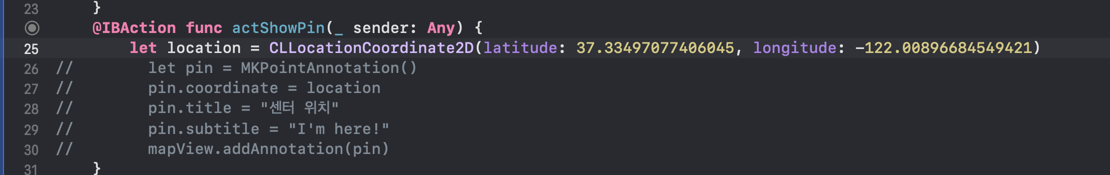 뷰 하단에 핀을 나타내는 버튼을 추가해주고 액션 설정을 해준다.