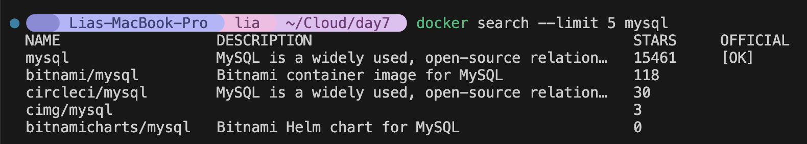 e.g.) docker search --limit 5 mysql