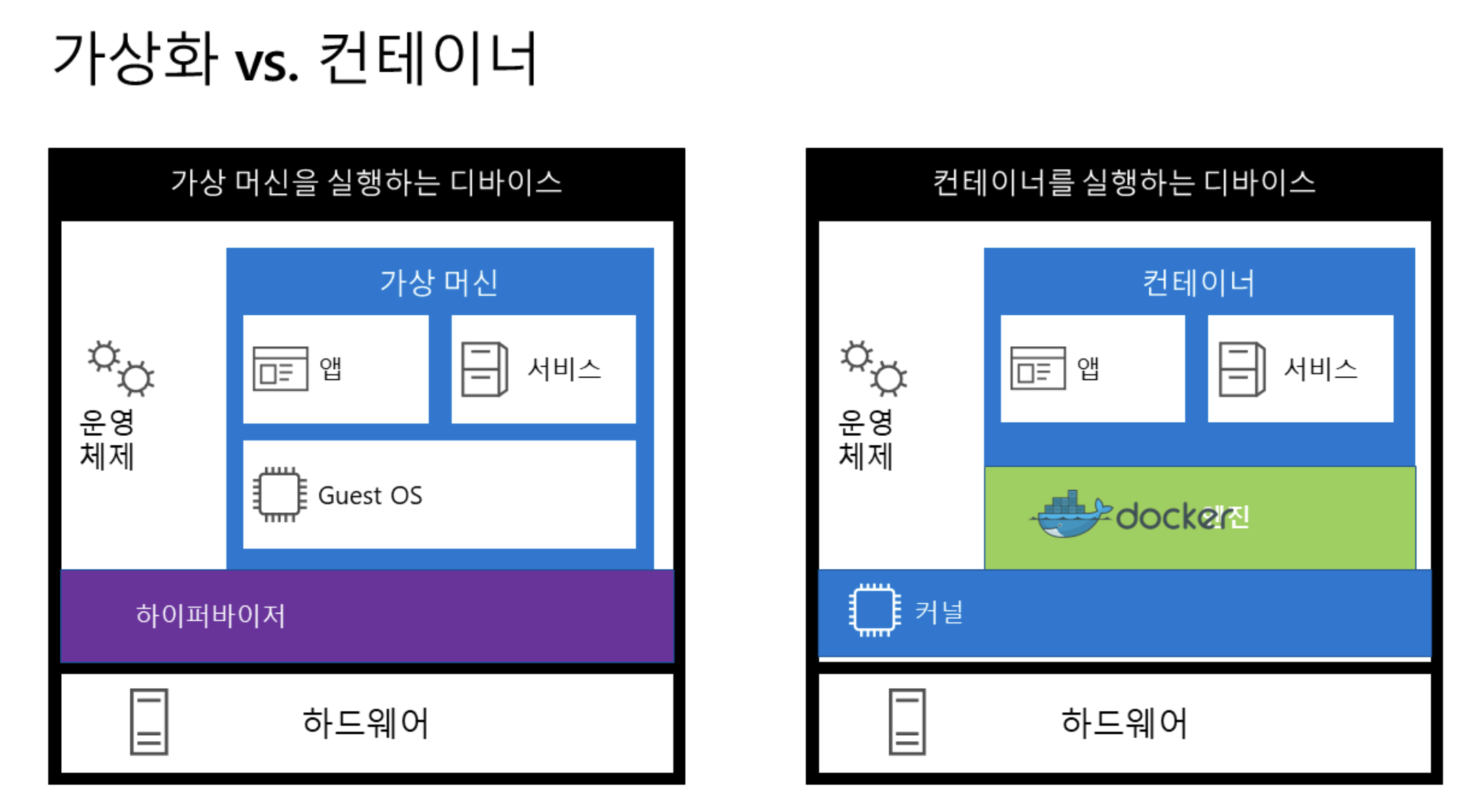 가상머신: 각각의 앱을 실행하기 위해 각각의 OS가 올라가므로 굉장히 무겁다.