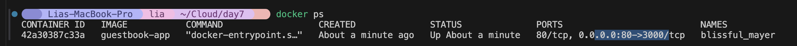 그런데, 명령어 docker ps를 켜서 현재 돌아가고 있는 컨테이너를 보면 PORTS 컬럼 아래에 80포트에서 3000 포트로 옮겨간 것이 보인다.