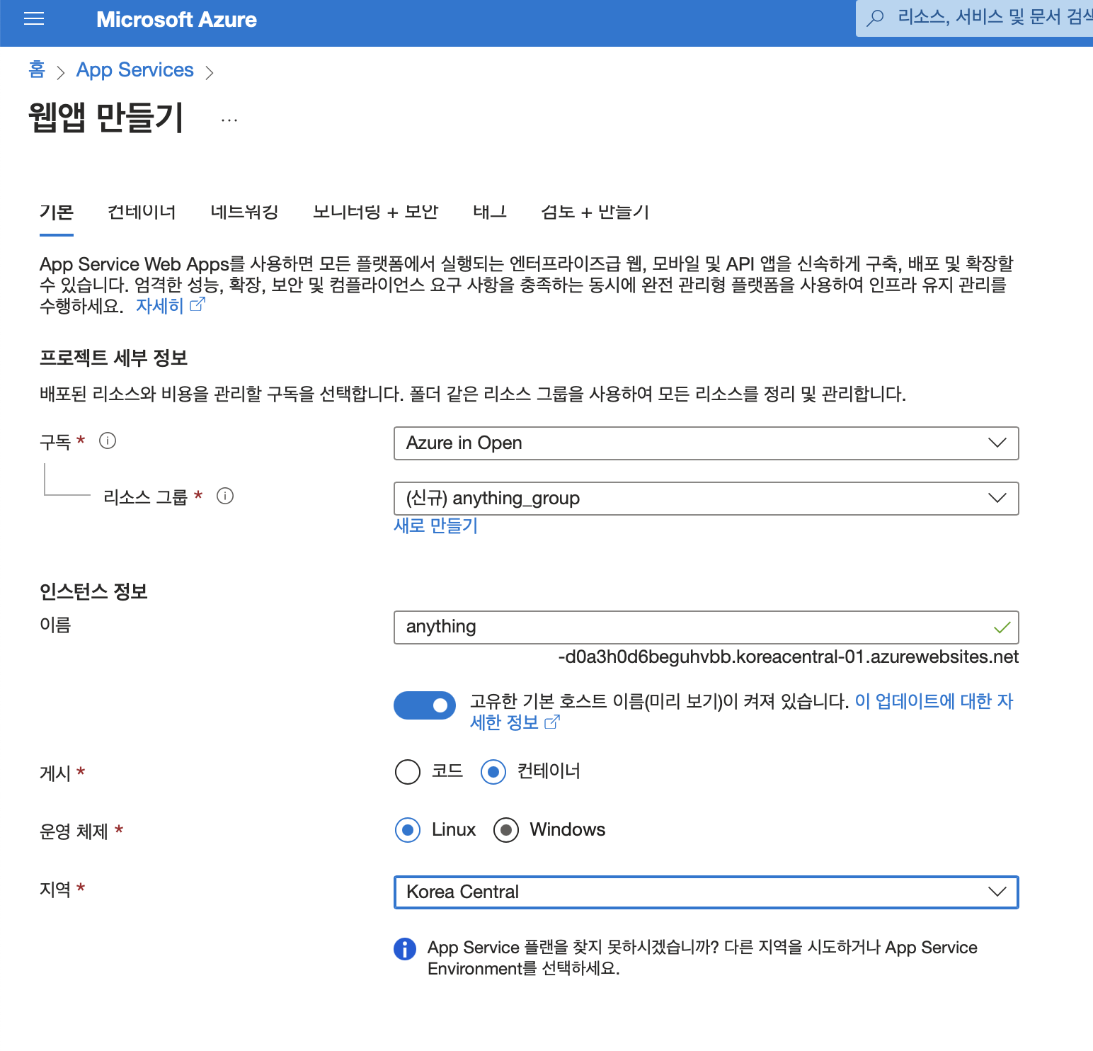2. 아래와 같이 이름은 망므대로, 게시는 '컨테이너', 운체는 'linux'로 해준다. 지역은 Korea Central로 설정