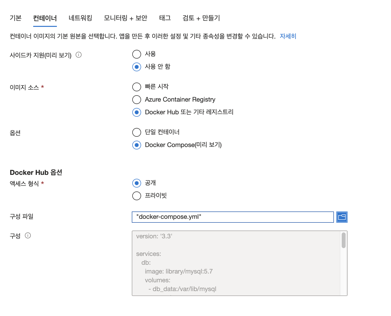 도커 컴포즈, Azure에 도커 yml 업로드해서 앱 배포하기 본문