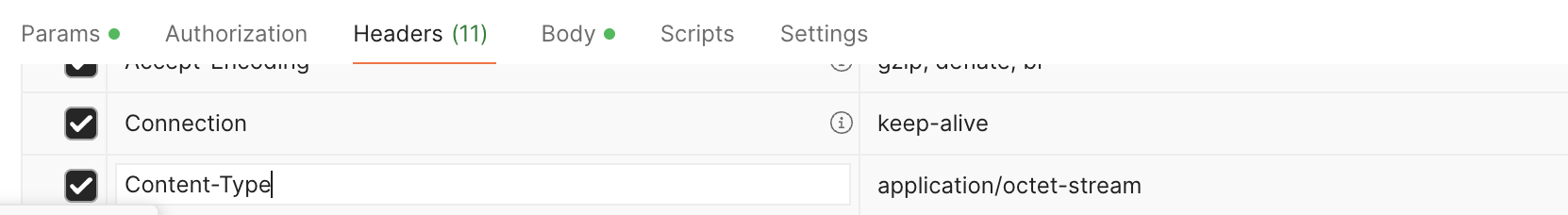 그리고 header에 Content-Type 는 Octet으로 새로 추가.