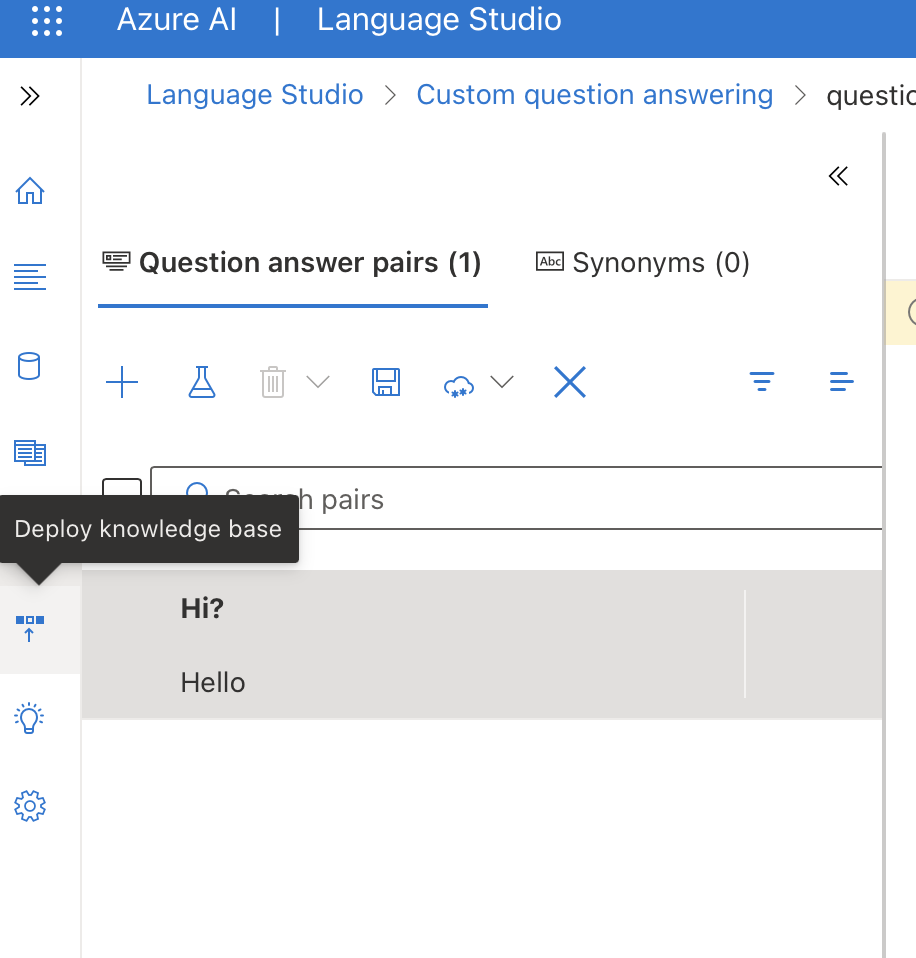 이제 좌측 아이콘에서 배포 버튼을 눌러준다. (Deply knowledge base 말풍선)