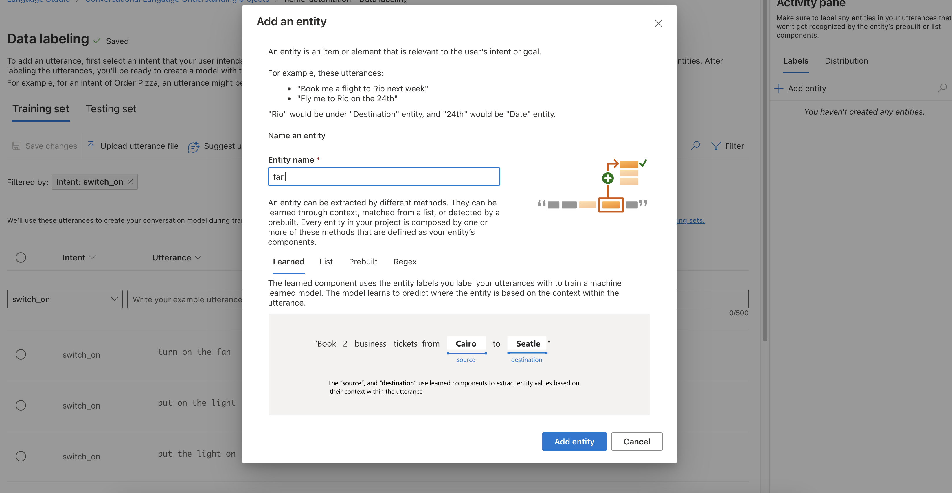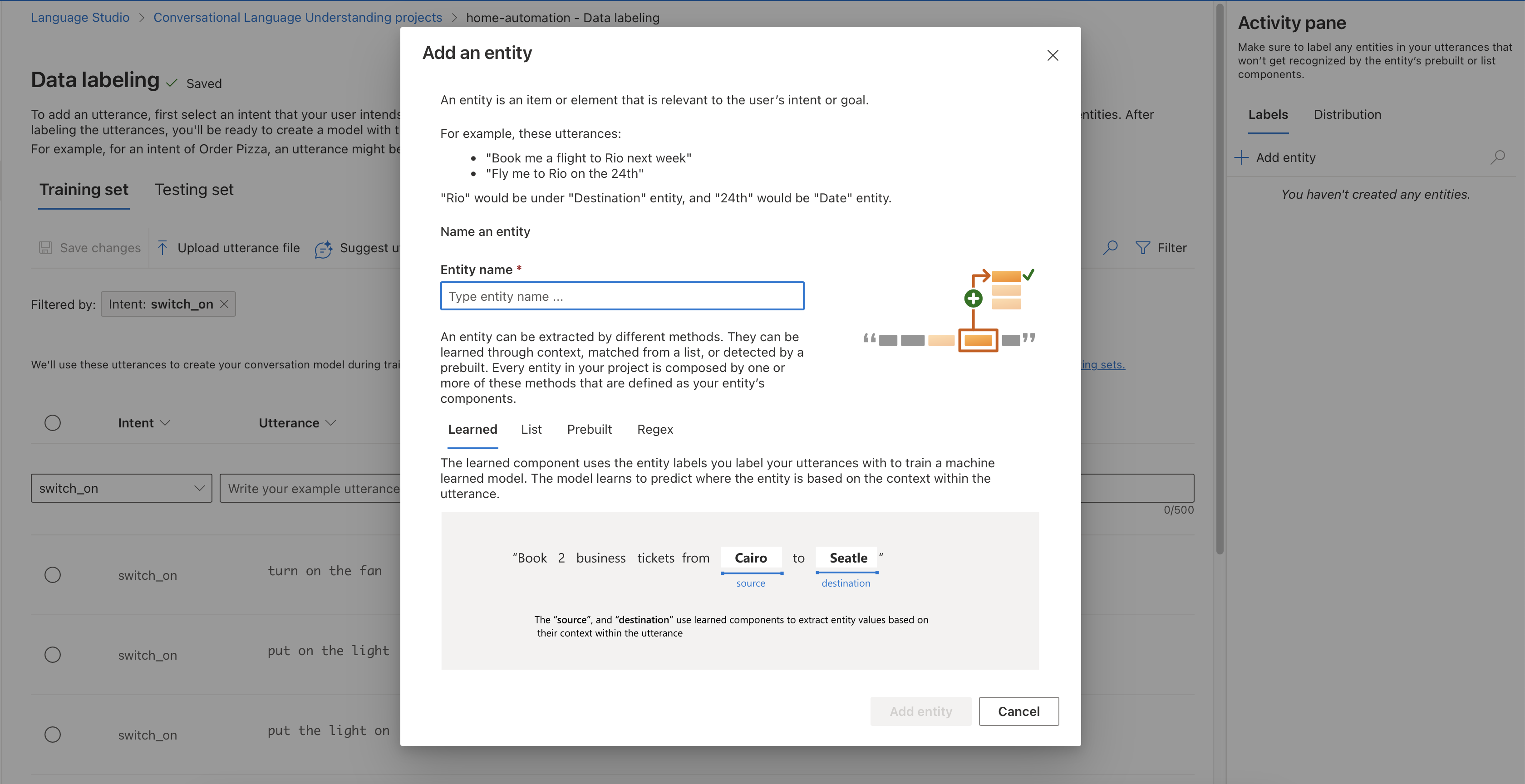 우측 Activity pane에서, 엔티티를 추가해준다.