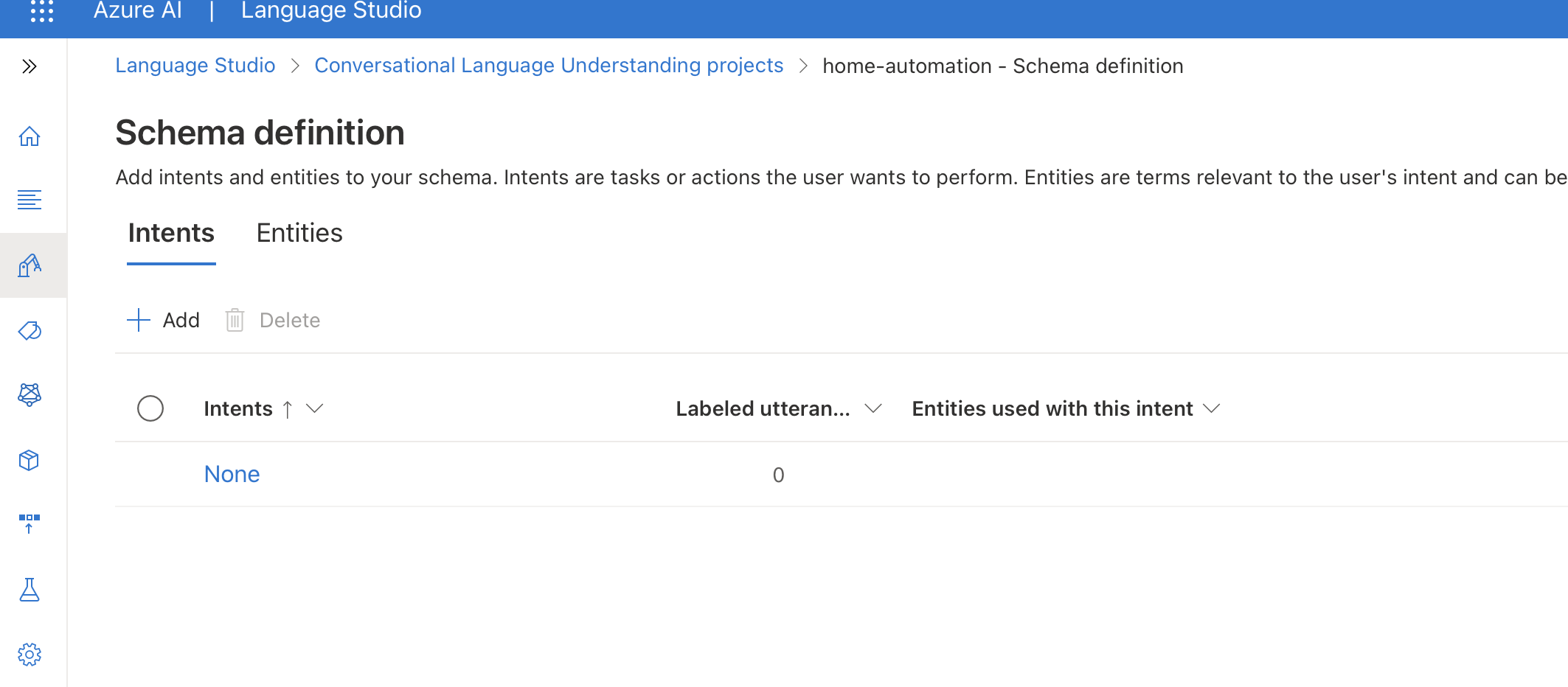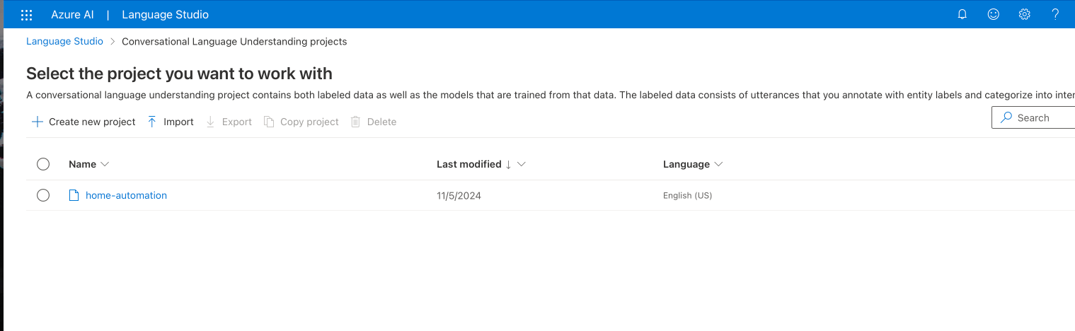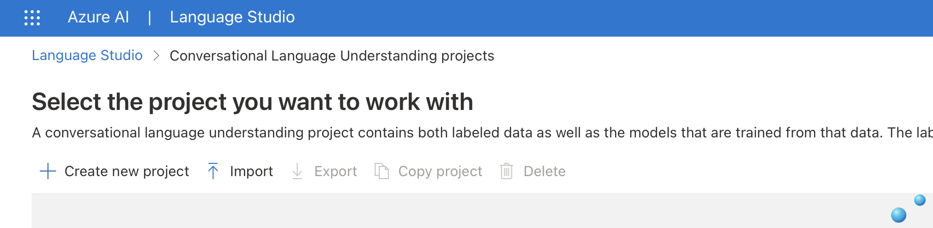 Create a new project를 클릭한 후, "Conversational Language Understanding" 옵션을 선택한다.