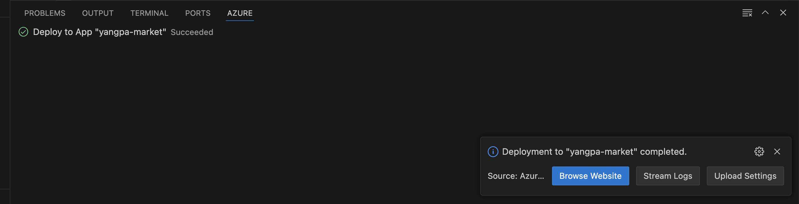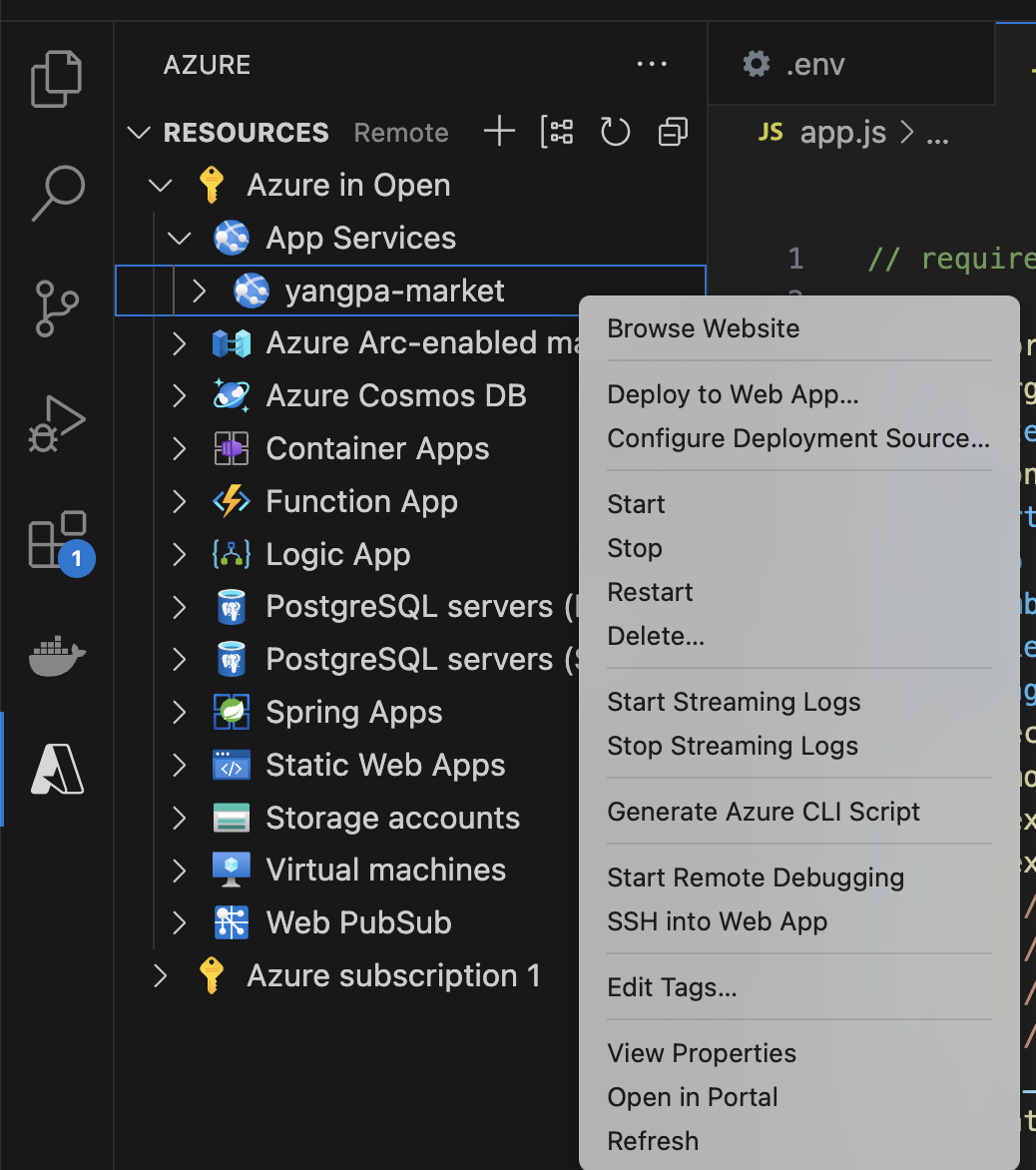 VS Code Extension에 Azure가 있어야한다. 계정에 로그인이 되어있다면, 방금 배포한 앱서비스가 목록에 나타날 것이다.
