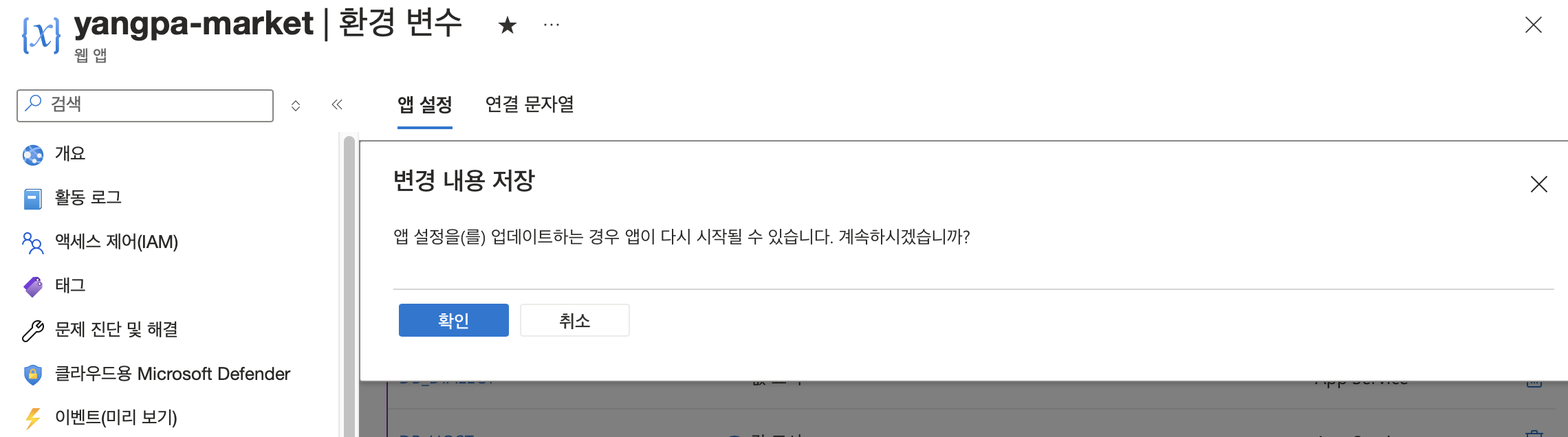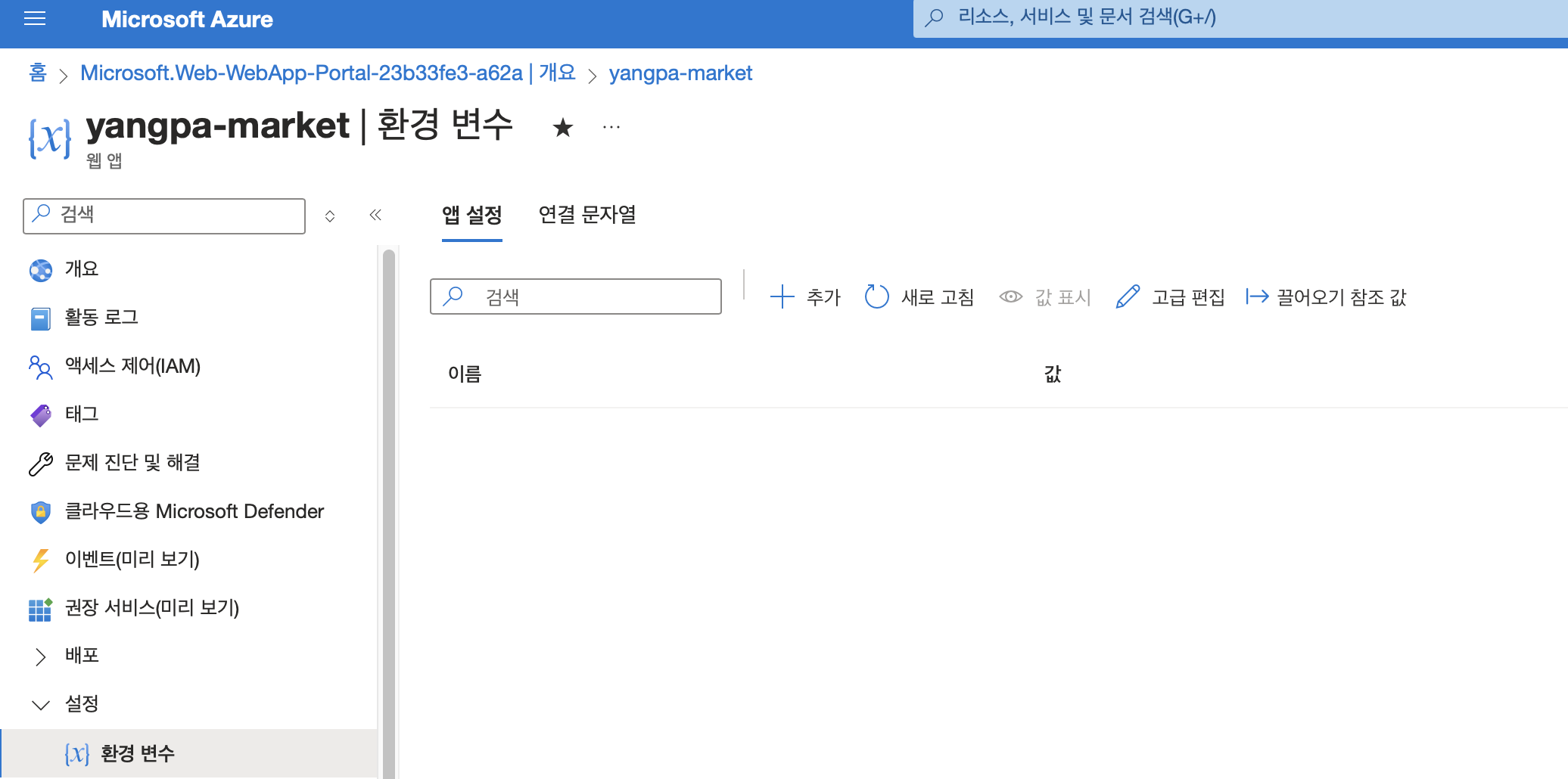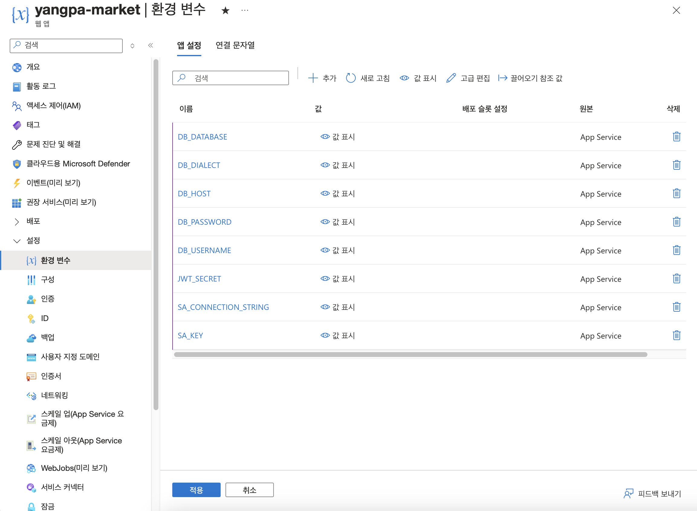 웹앱 > 설정 > 환경 변수로 와서, 로컬 프로젝트의 .env에 있는 모든 변수들을 추가해줄것이다.