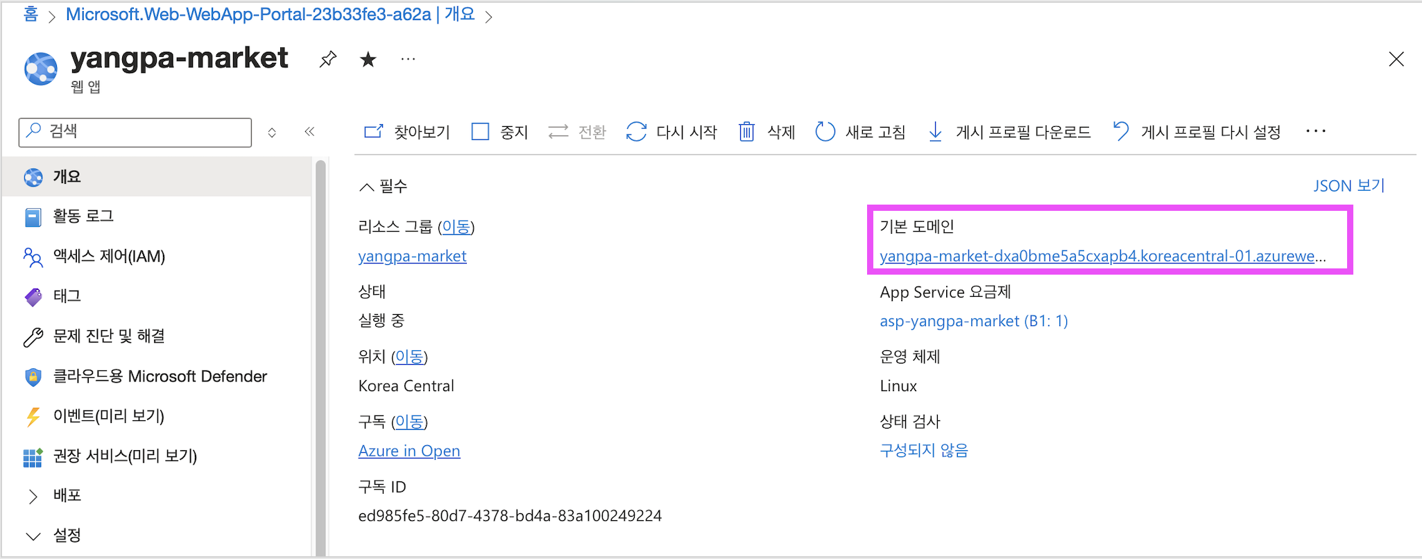 아까 웹엡에서의 기본 도메인을 복사해온다.