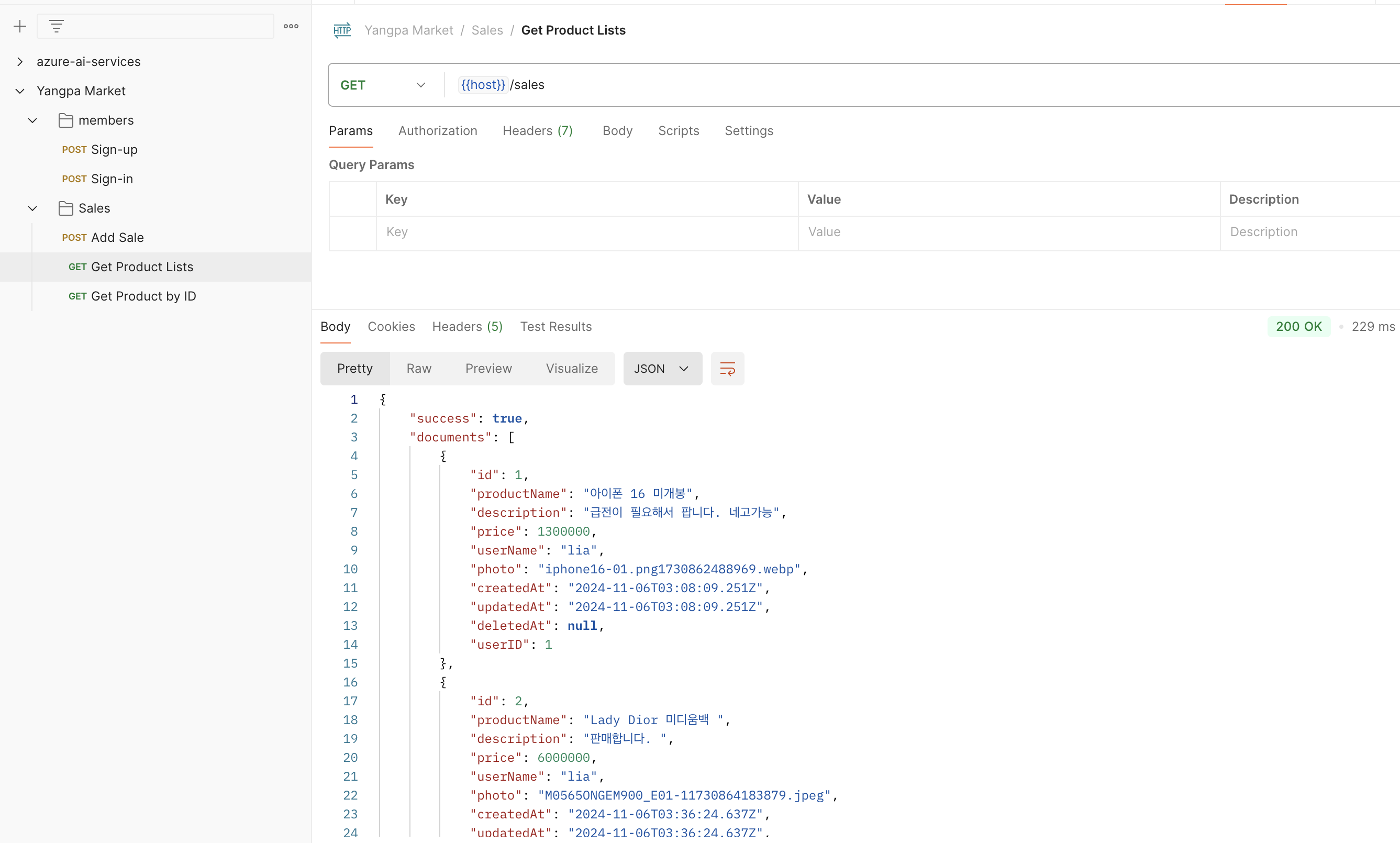 Postman에서 Azure 환경으로 설정 적용 후 테스트