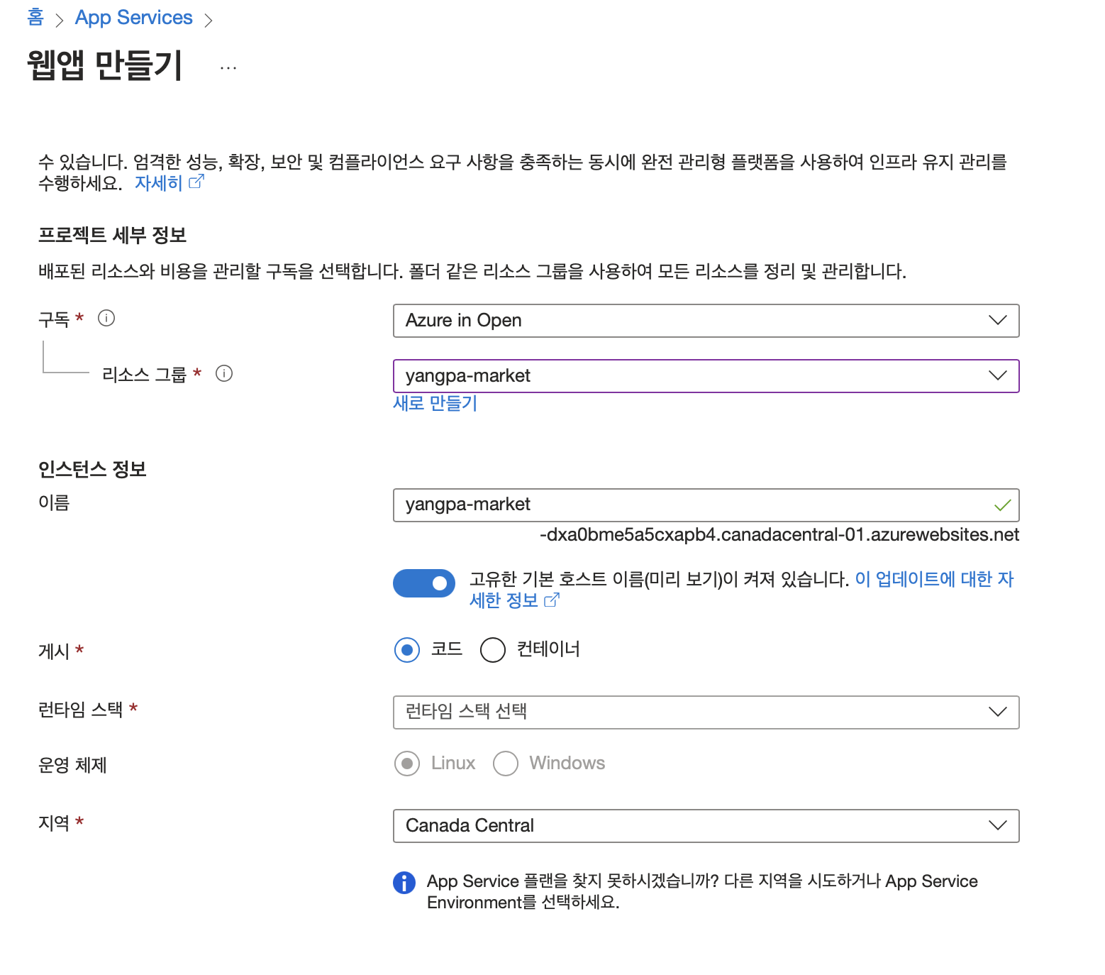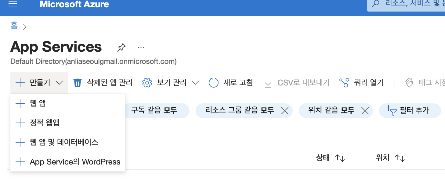 Azure Portal로 가서, 앱 서비스를 생성한다.