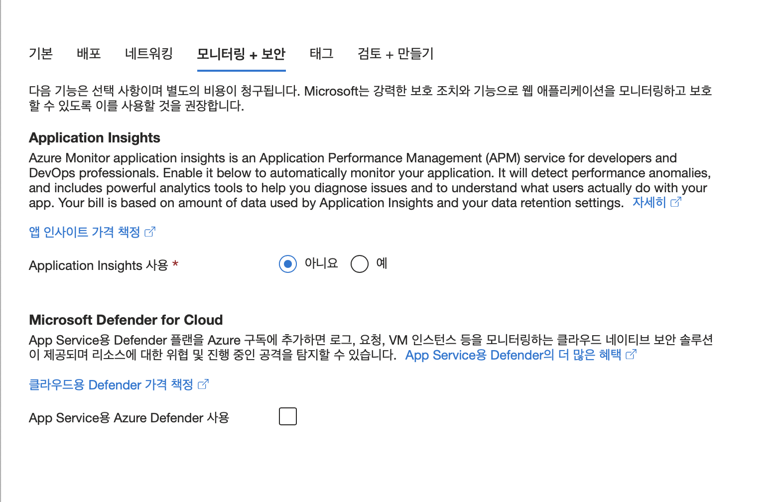 마지막으로 모니터링+보안 항목에서 Application Insights 사용 옵션을 "아니요"로 선택한 후 "만들기" 버튼을 누른다.