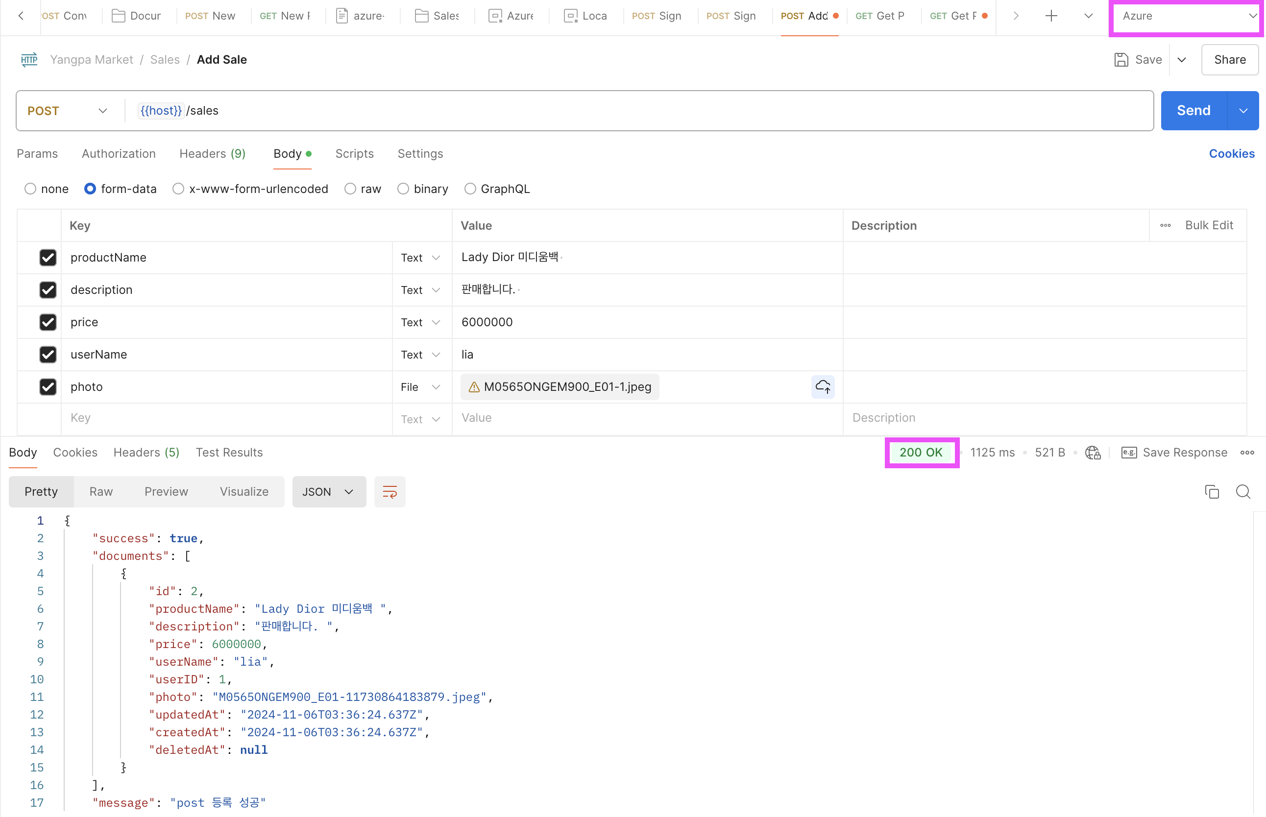 그리고 이제 환경변수를 Azure로 바꿔서 요청을 테스트 해본다.