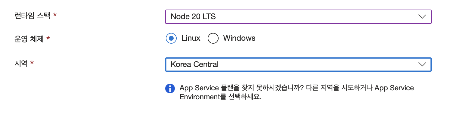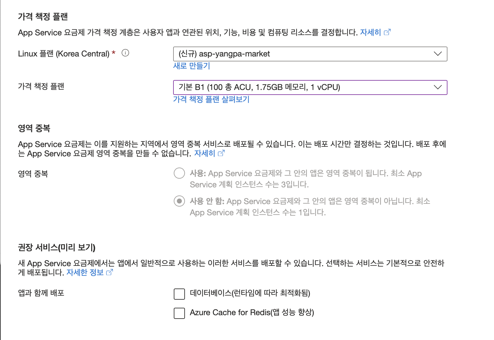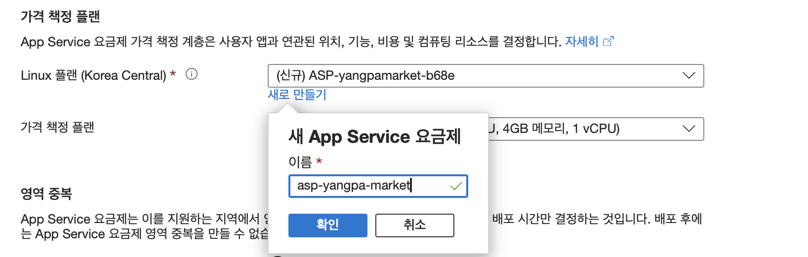 아래쪽에 새 앱서비스 플랜을 만들어주는데 이름은 그냥 App Service Plan의 줄임말인 asp로 설정했다. 다른것들과 구분하기 위해