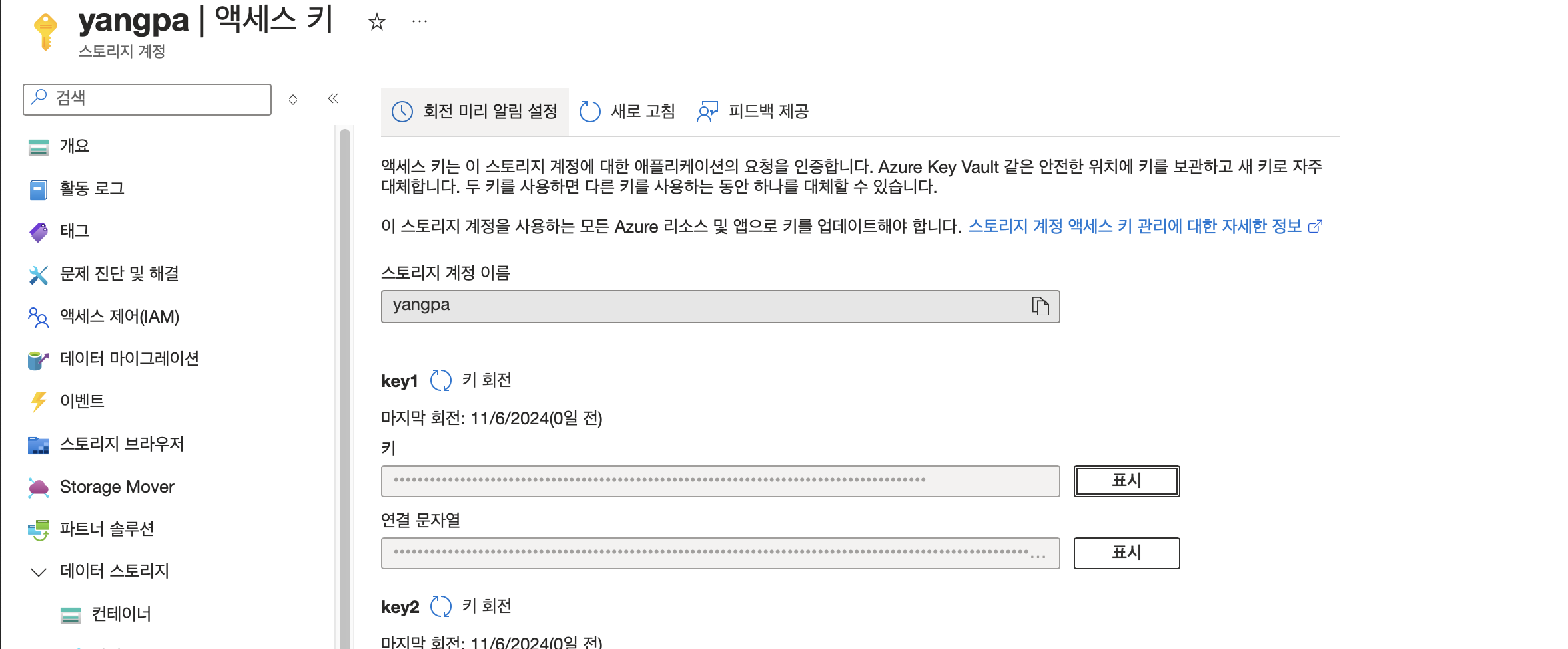 가면 각각 키와 연결 문자열이 있는데, 이를 복사해서 각각 내 로컬의 .env 에 있는 SA_KEY, SA_CONNECTION_STRING 에 붙여놓기한다.