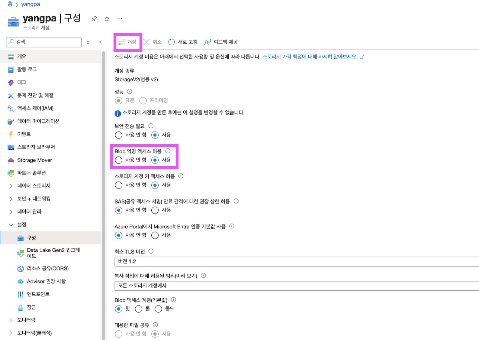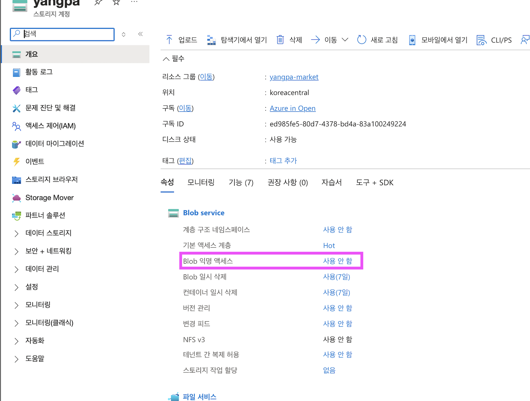 이제 생성된 리소스로 이동해서 개요 > Blob 익명 엑세스를 현재 "사용 안 함"으로 되어있는데,