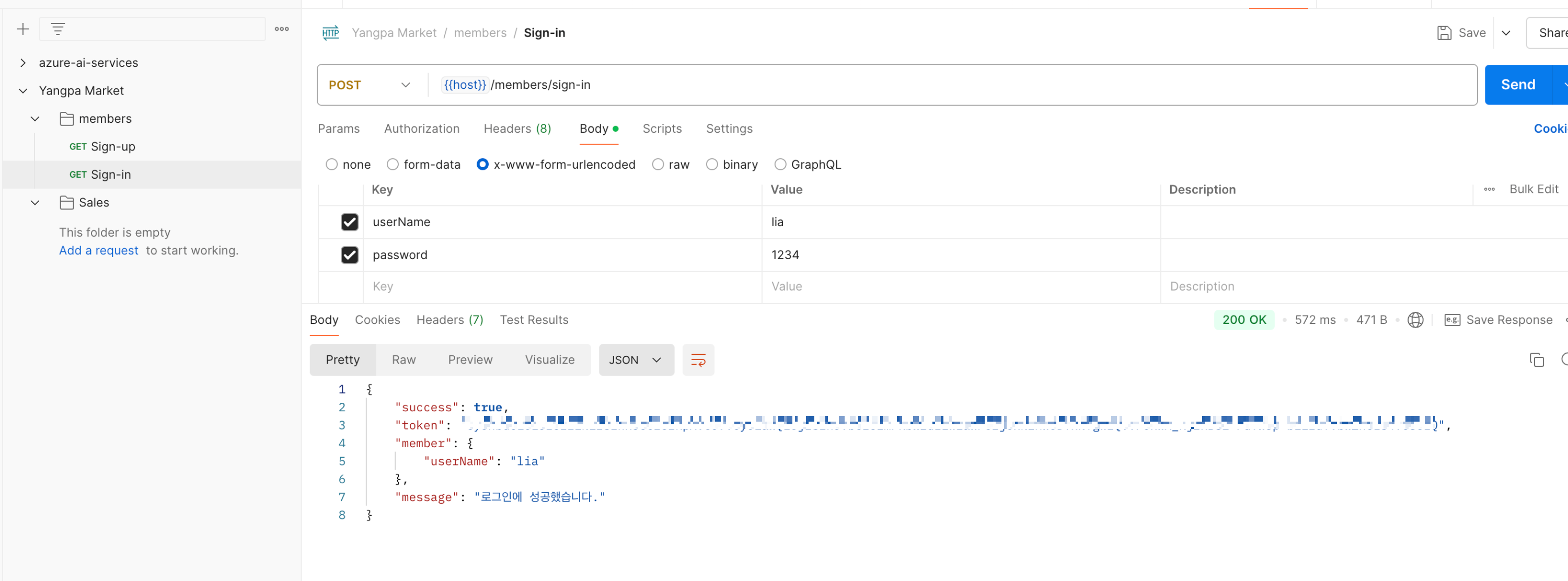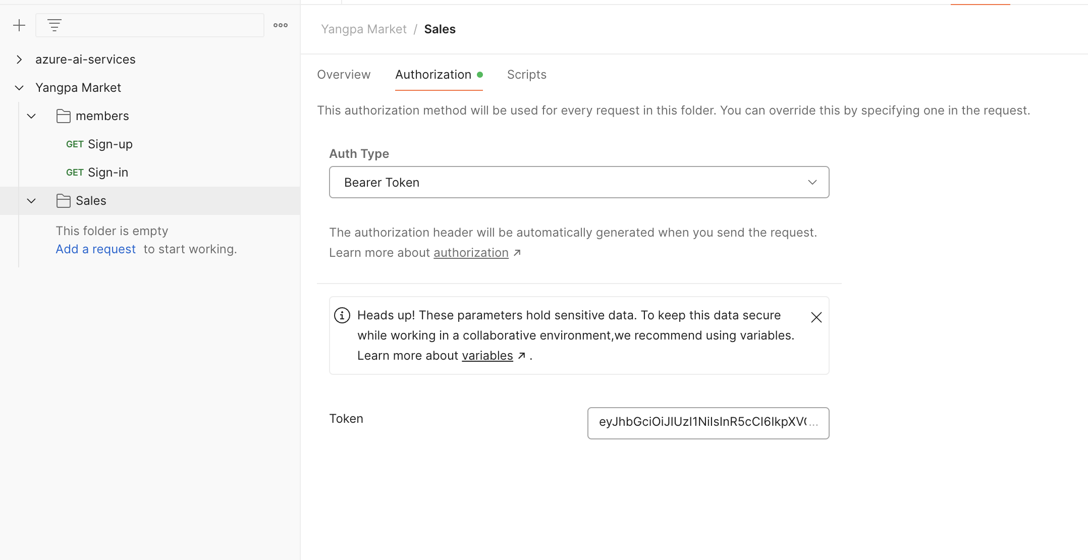 실질적인 기능을 하는 Sales 라는 폴더를 만들어서 Bearer Token 으로 저장해놓고 계속 로그인 세션이 유효한것처럼 사용해줄것이다.