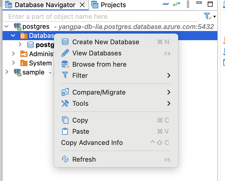 3. 정상적으로 연결된 데이터베이스에, 우클릭을 해서 Create new database 을 클릭한다.