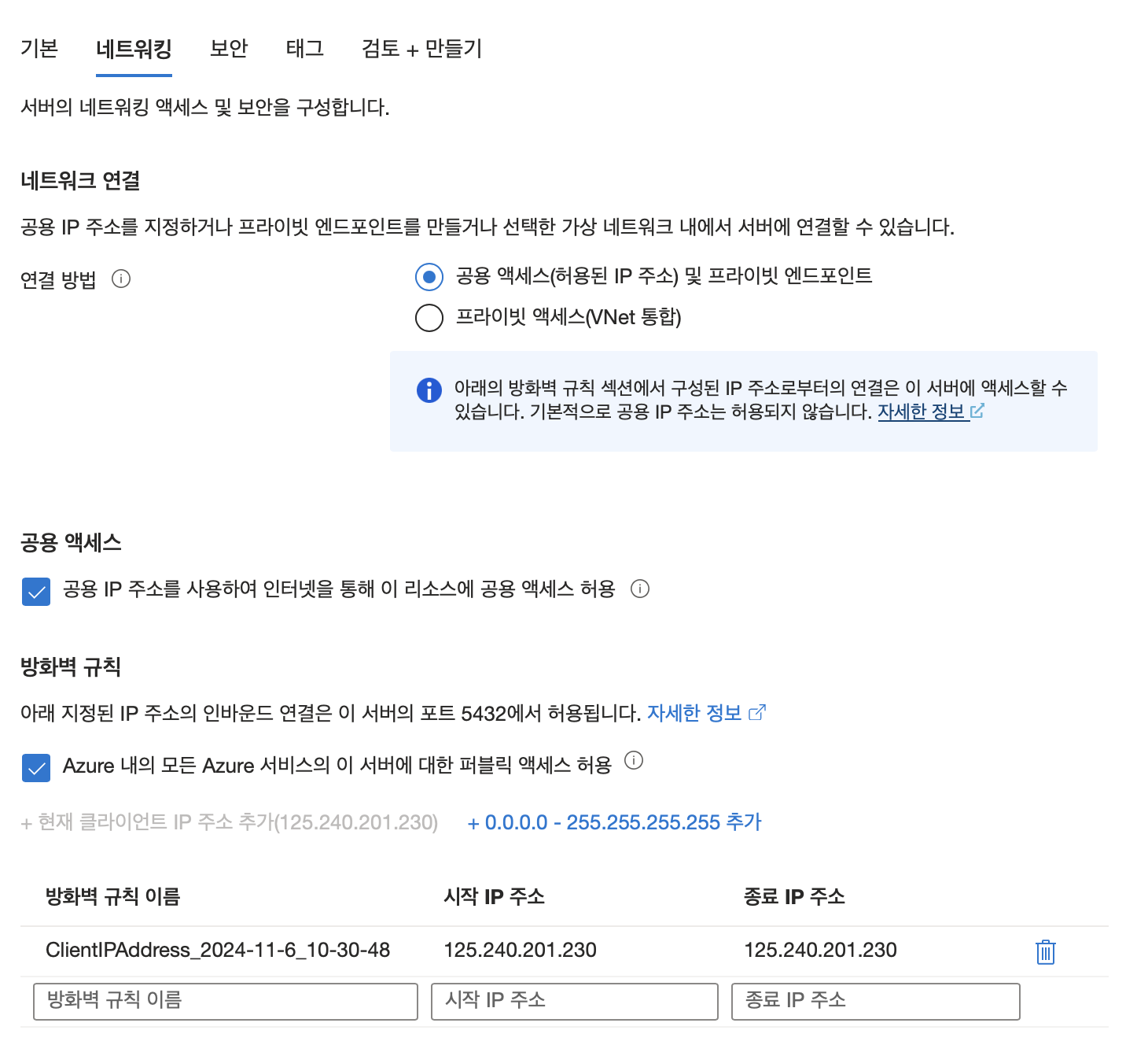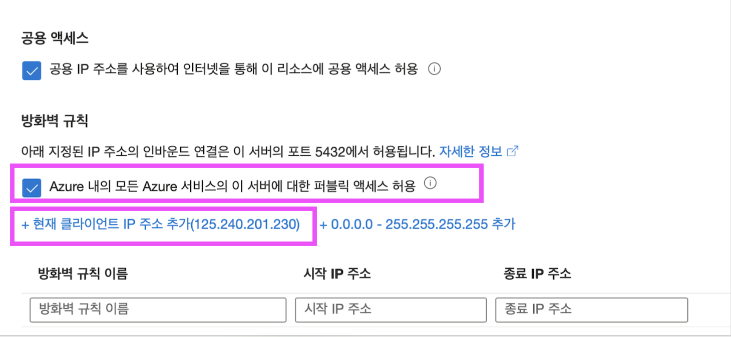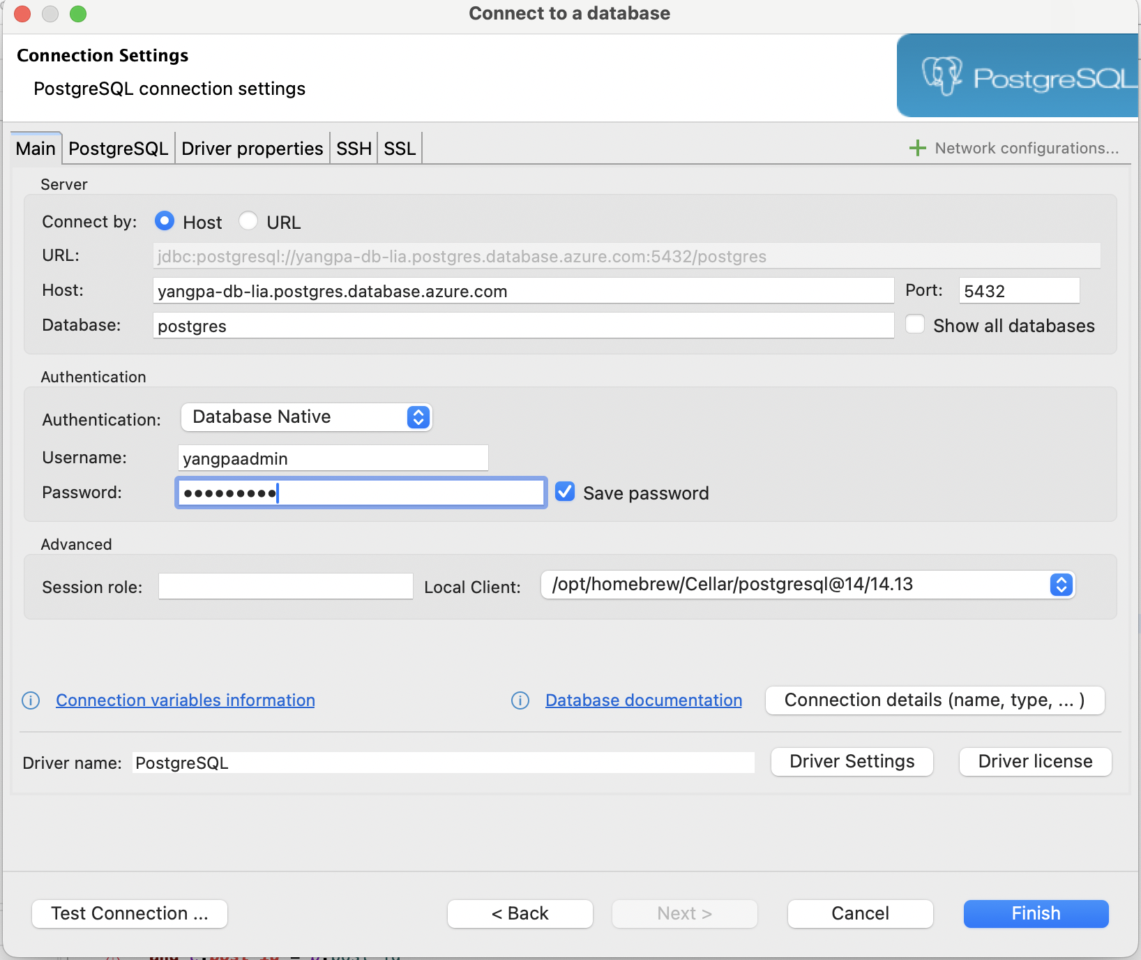 Auth에는 처음에 Azure DB for PostgreSQL에서 설정했던 username과 비밀번호를 입력해준다.