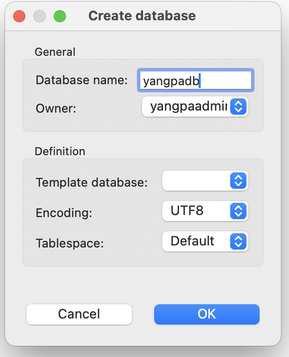 Database를 방금 생성한 yangpadb로 바꾼다.