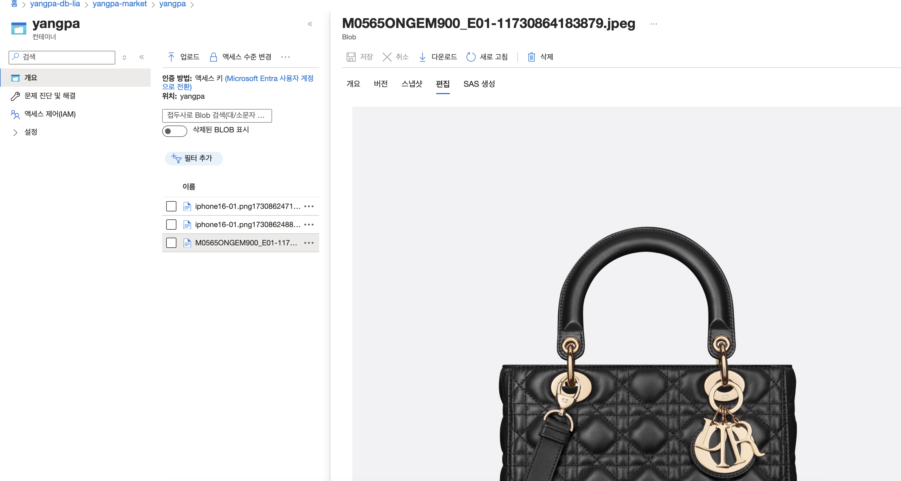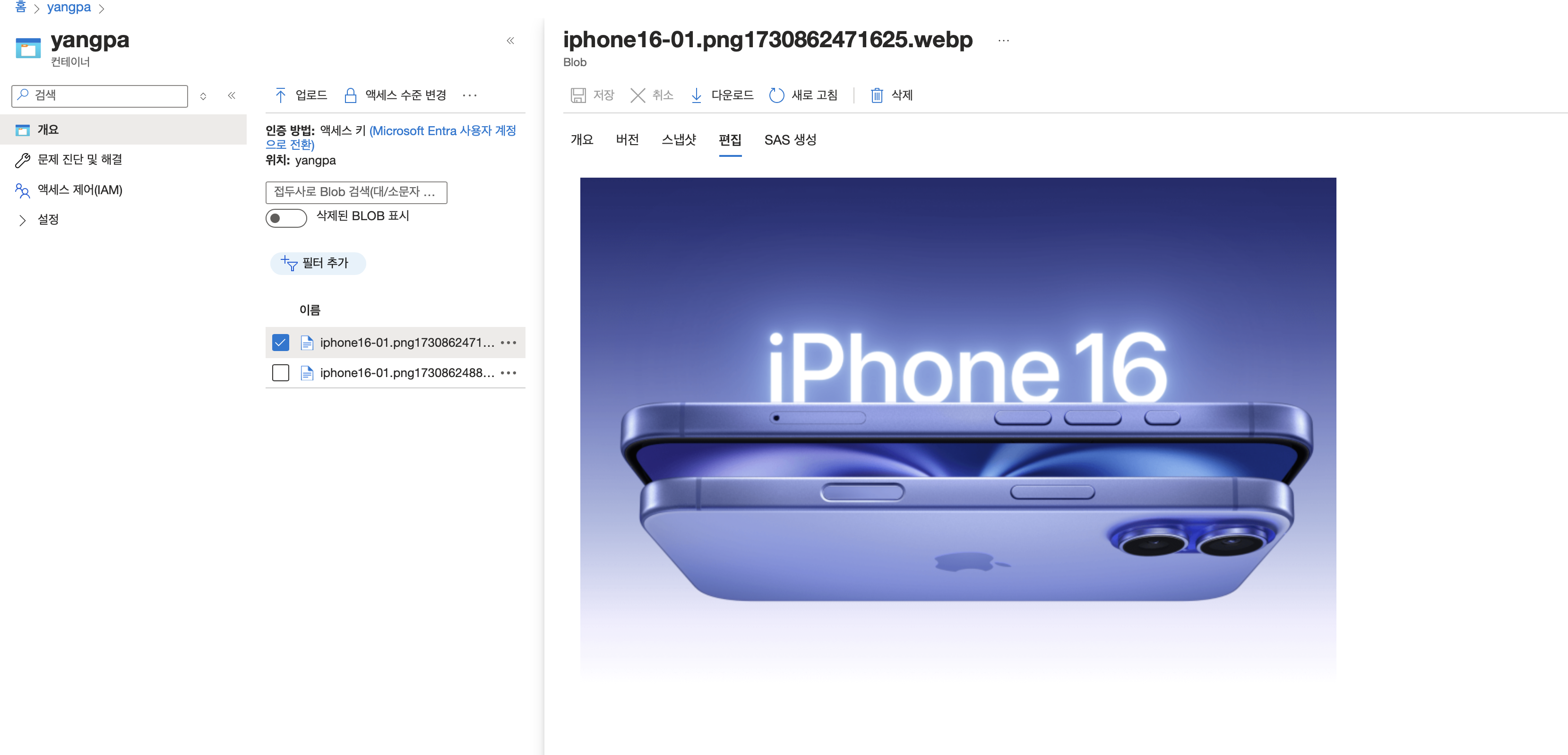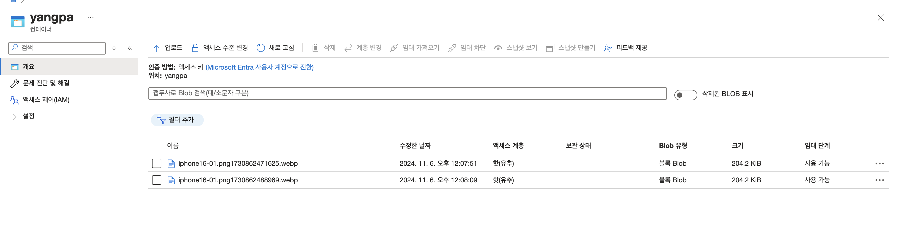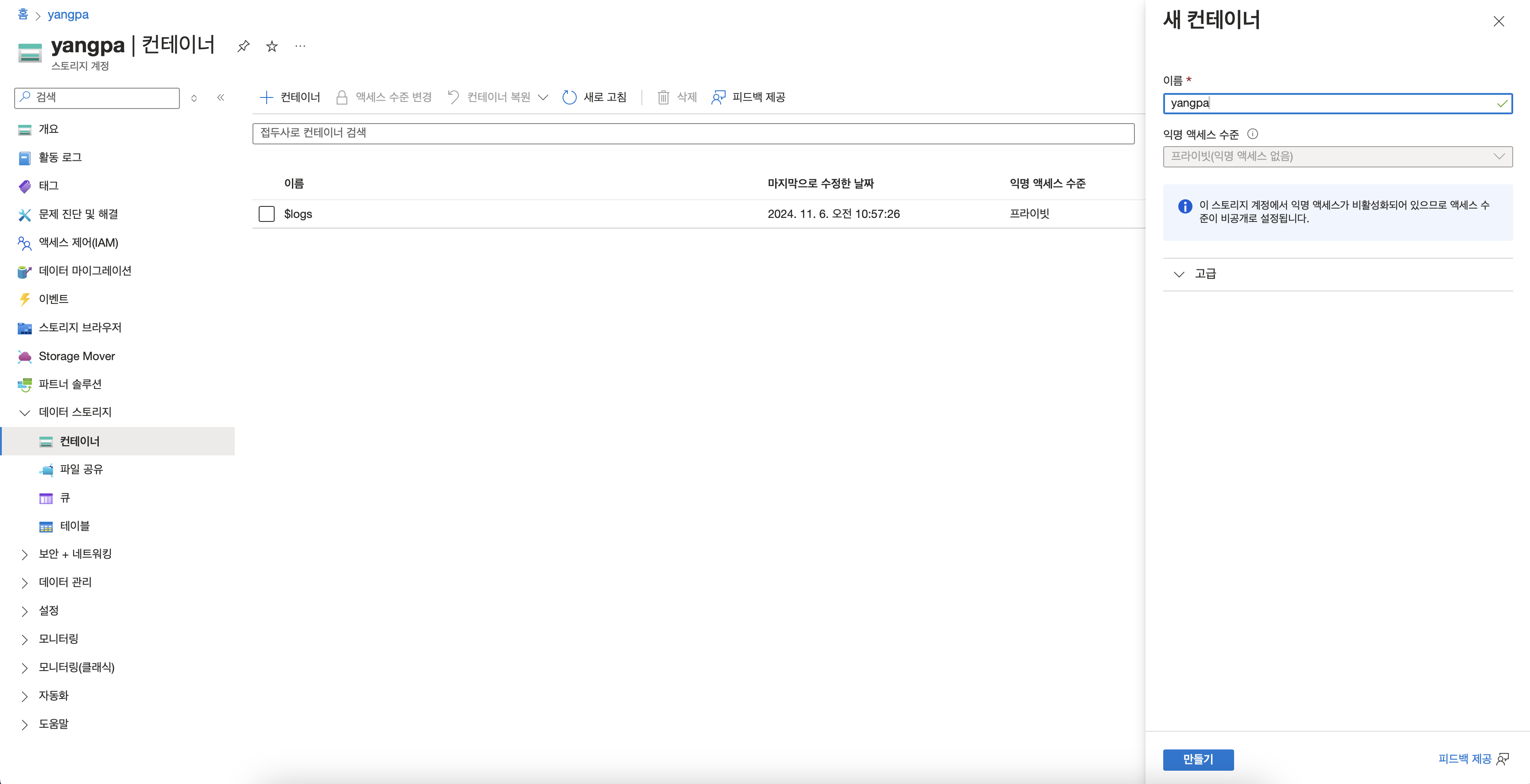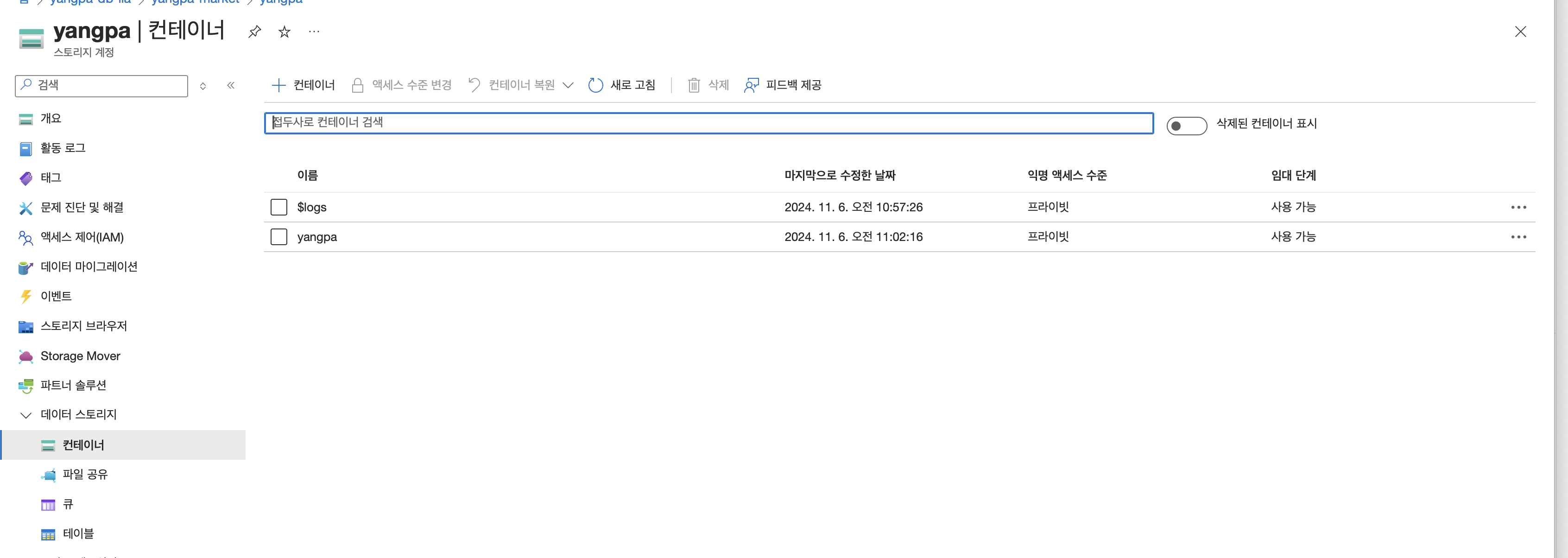 애져에도 잘 반영되었는지 확인해보기 위해, 리소스 그룹> 스토리지 계정 > 좌측 메뉴 데이터 스토리지 > 컨테이너에 들어가 내가 방금 생성한 yangpa 컨테이너로 들어간다.