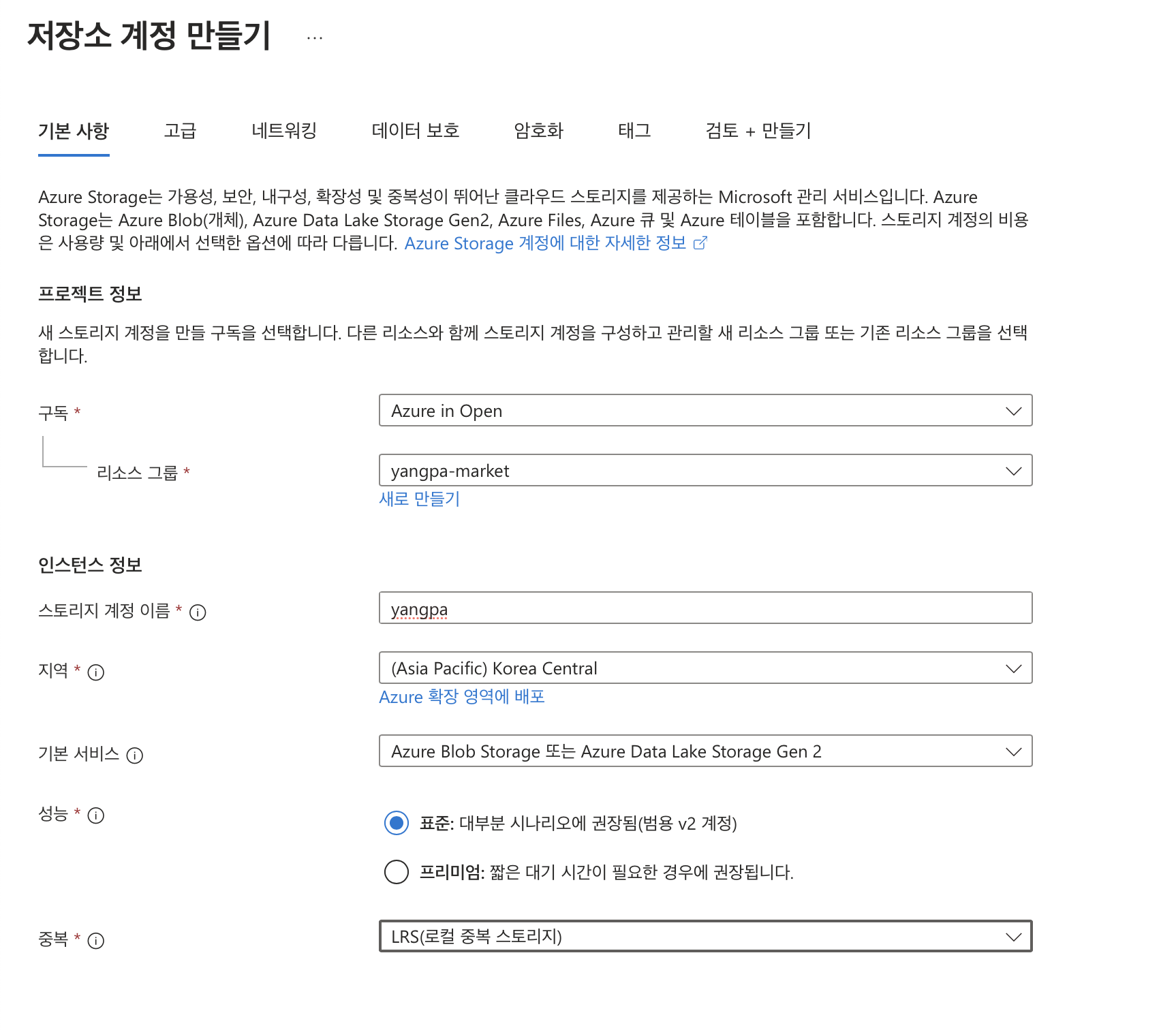 다음 데이터 스토리지 > 컨테이너에 가서, 새 컨테이너를 만들어준다.