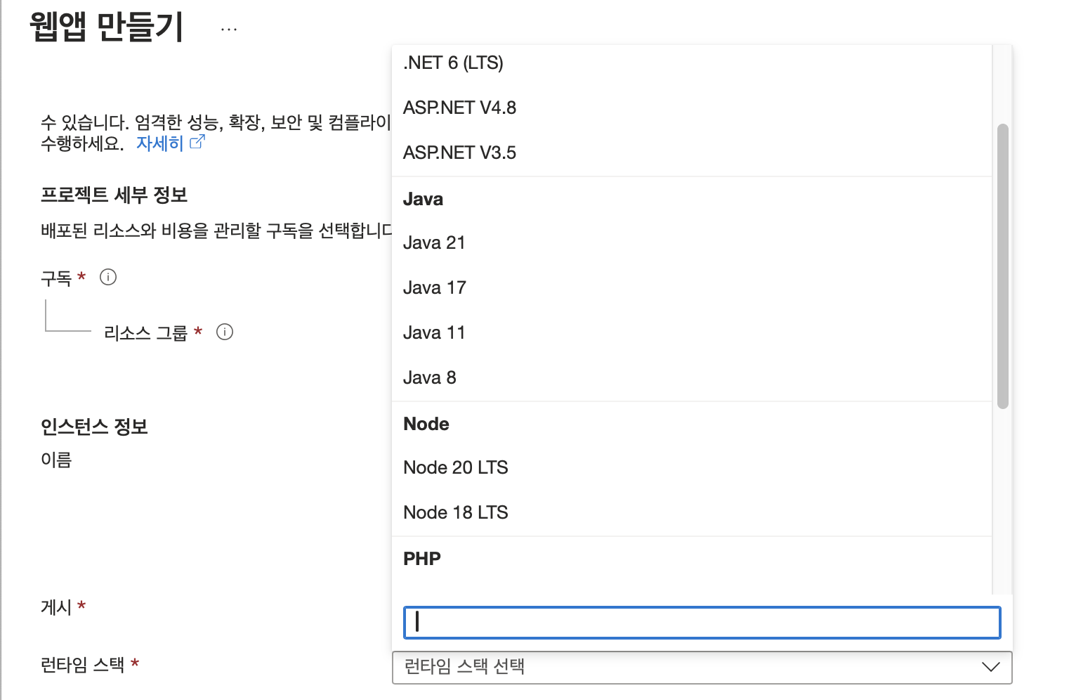 백엔드가 node js라서 동적으로 바뀌므로 "웹 앱"을 생성한다.