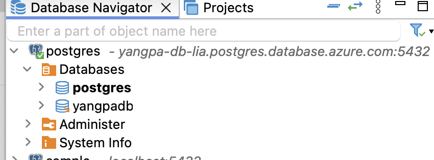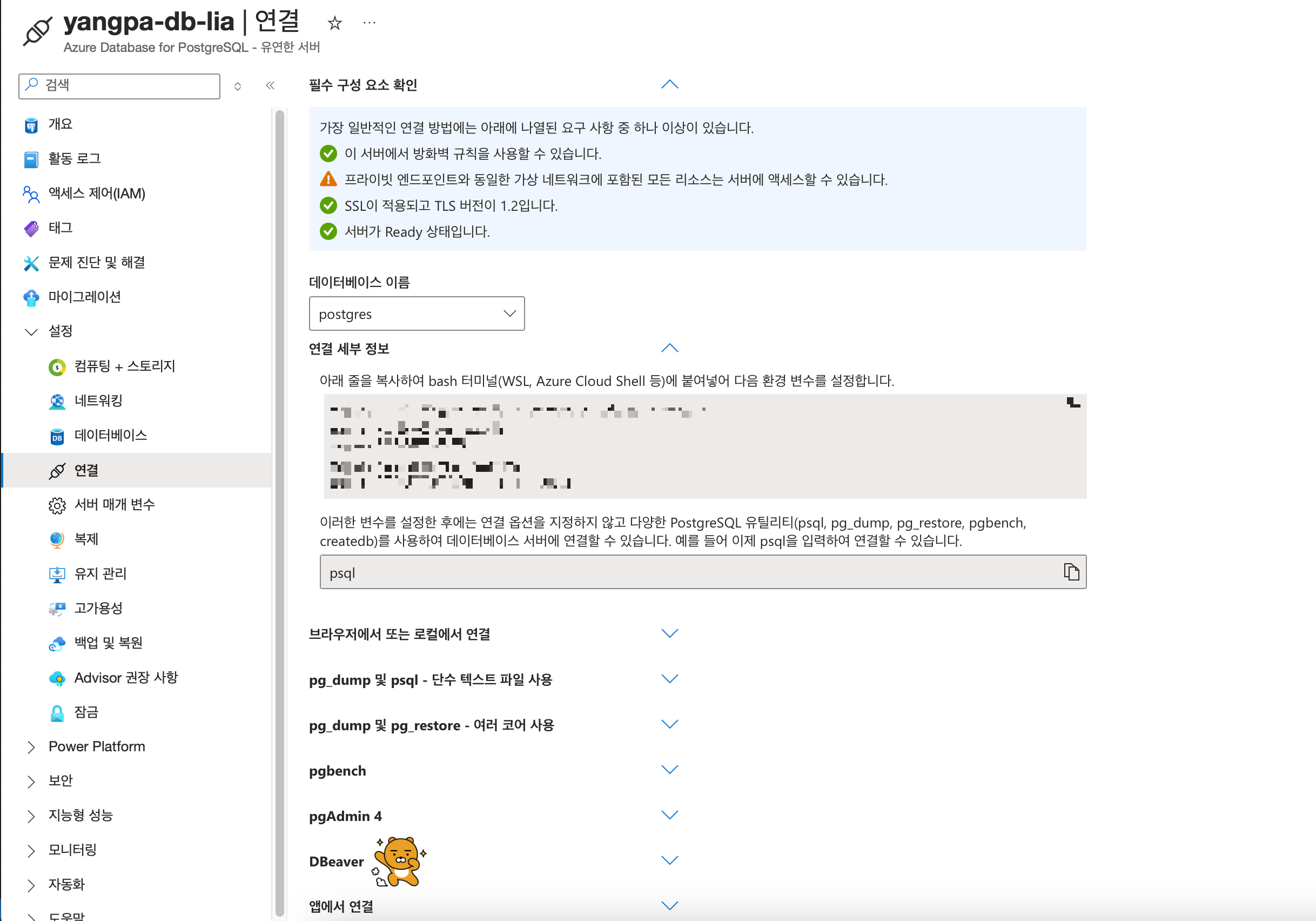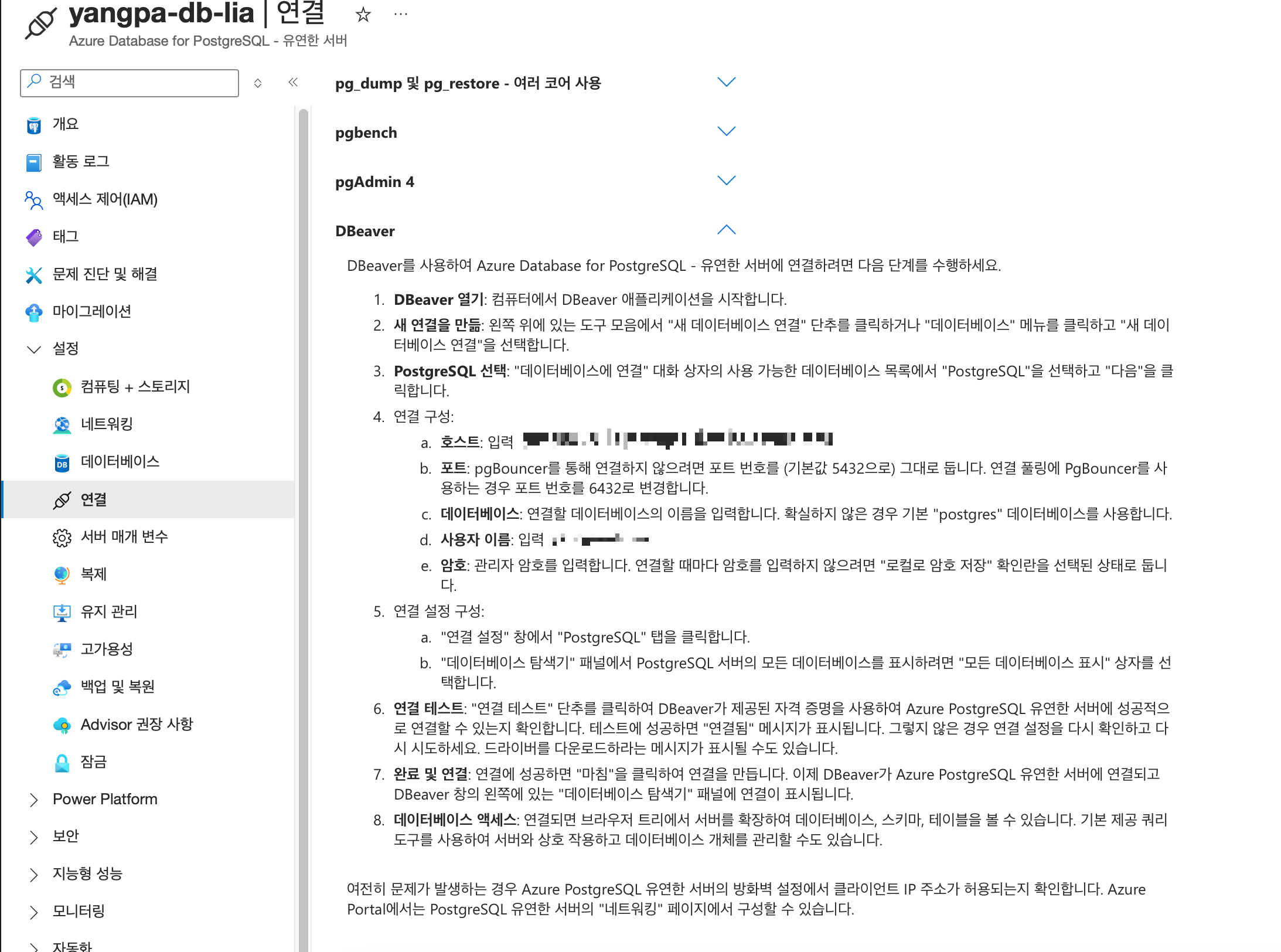 다시 아까 생성한 postgre DB로 들어와서, 아래 "연결"을 선택한다.