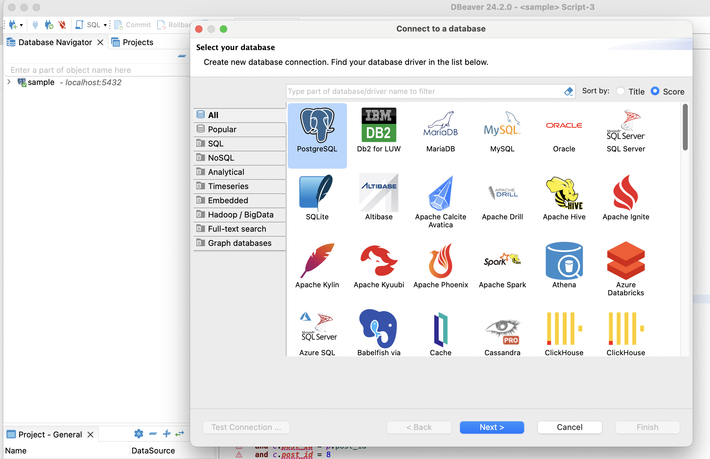 1. 새 DB 연결 아이콘을 눌러서 PostgreSQL을 선택한다.