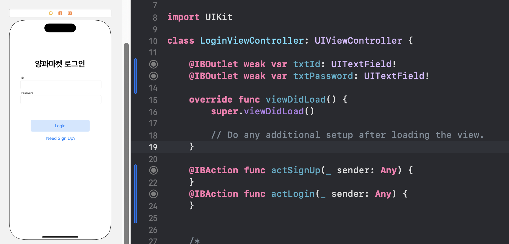 이렇게 하는 이유는, Navigation Segue로 연결을 하면 골치가 아프다. 왜냐하면 계속 신경을 써주고 딸려오고 처리를 해주어야하기 때문에, 로그인같은 경우는 이렇게 코드로 연결해주는게 좋다.