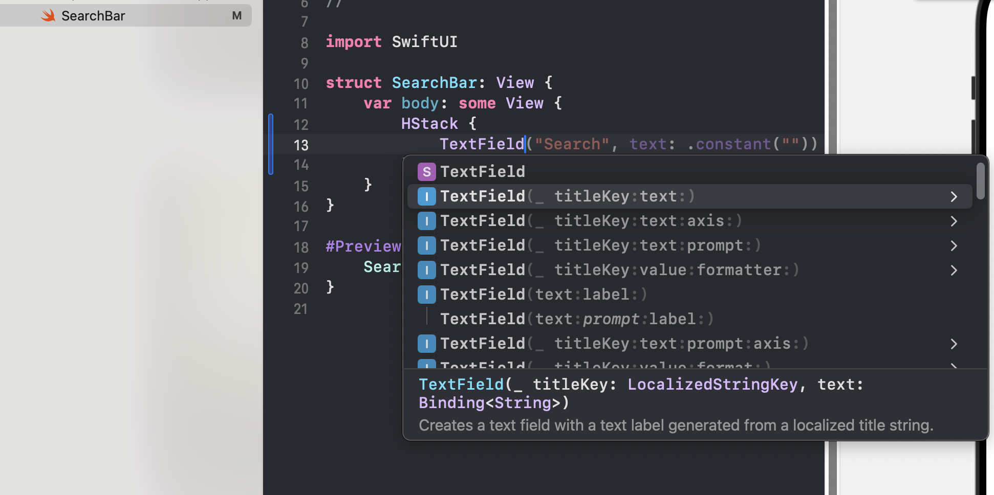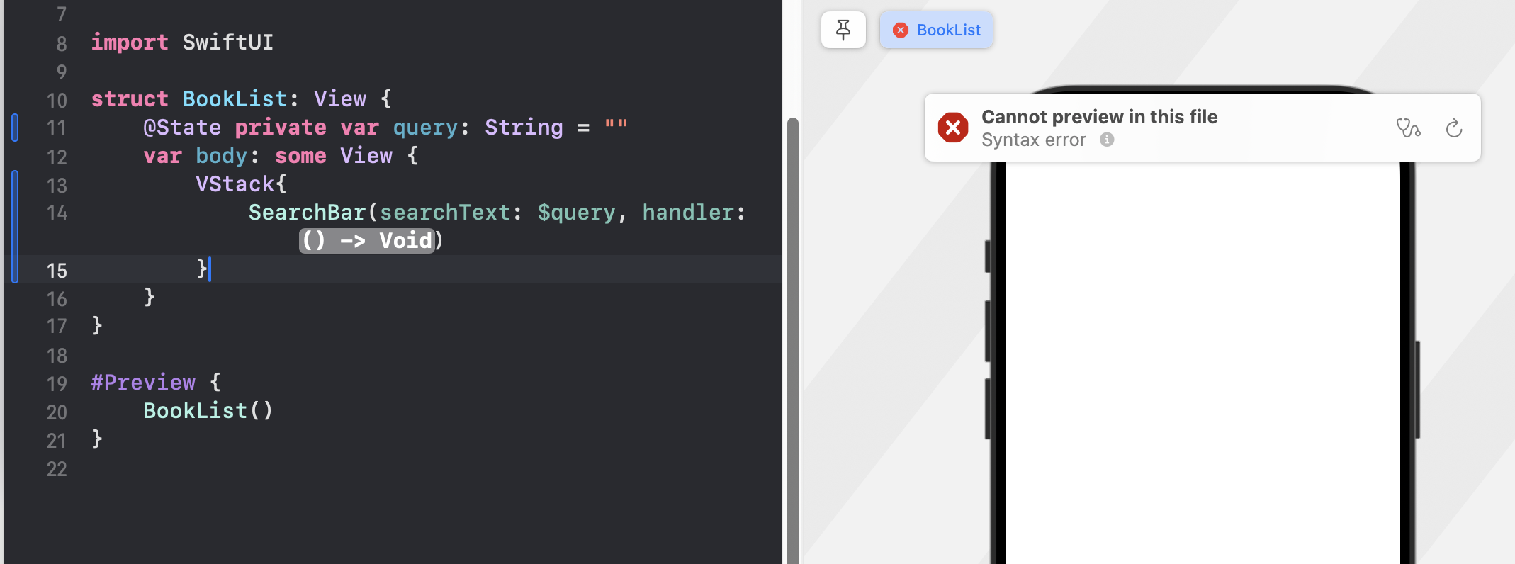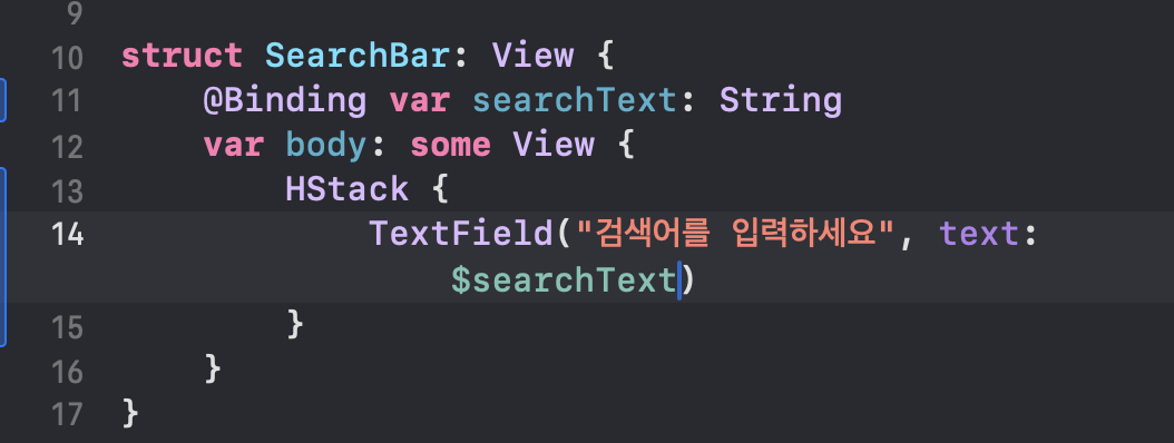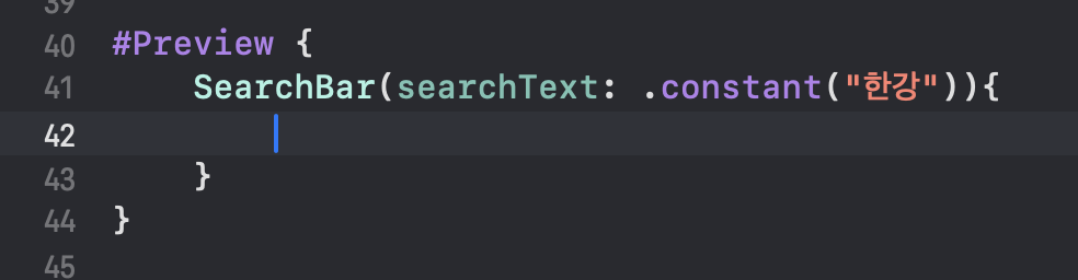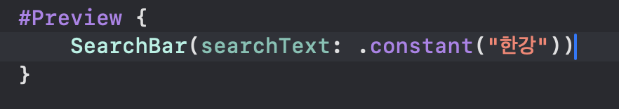 에러를 없애주기 위해, Preview에서 아래와 같이 SearchBar() 안에 값을 넣어준다.
