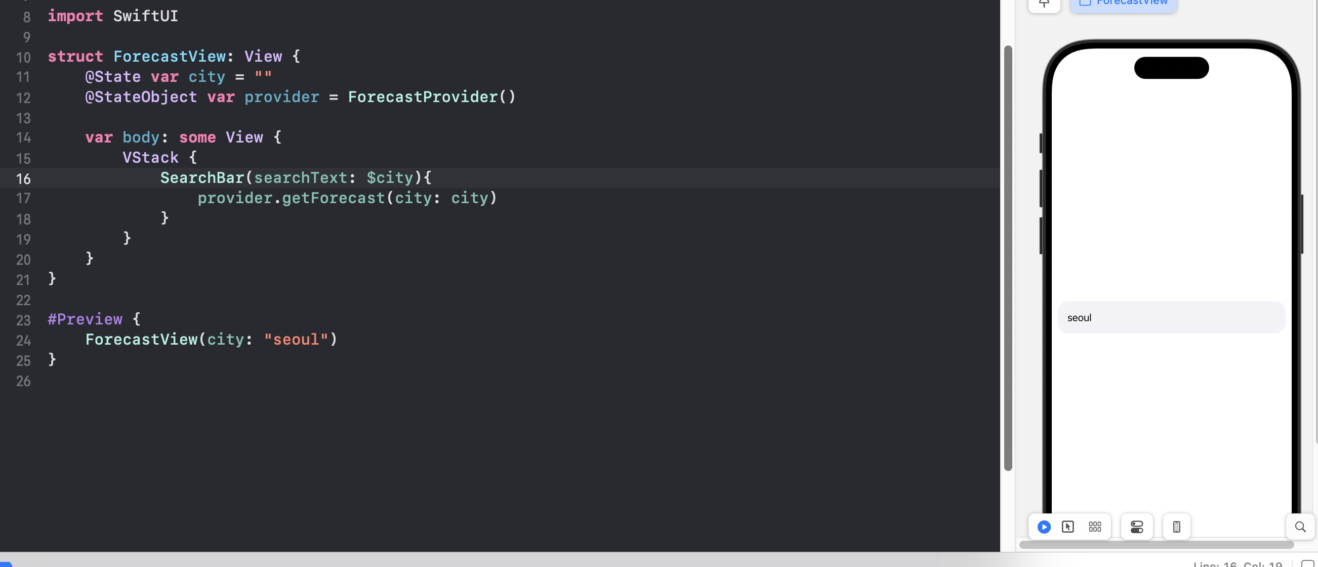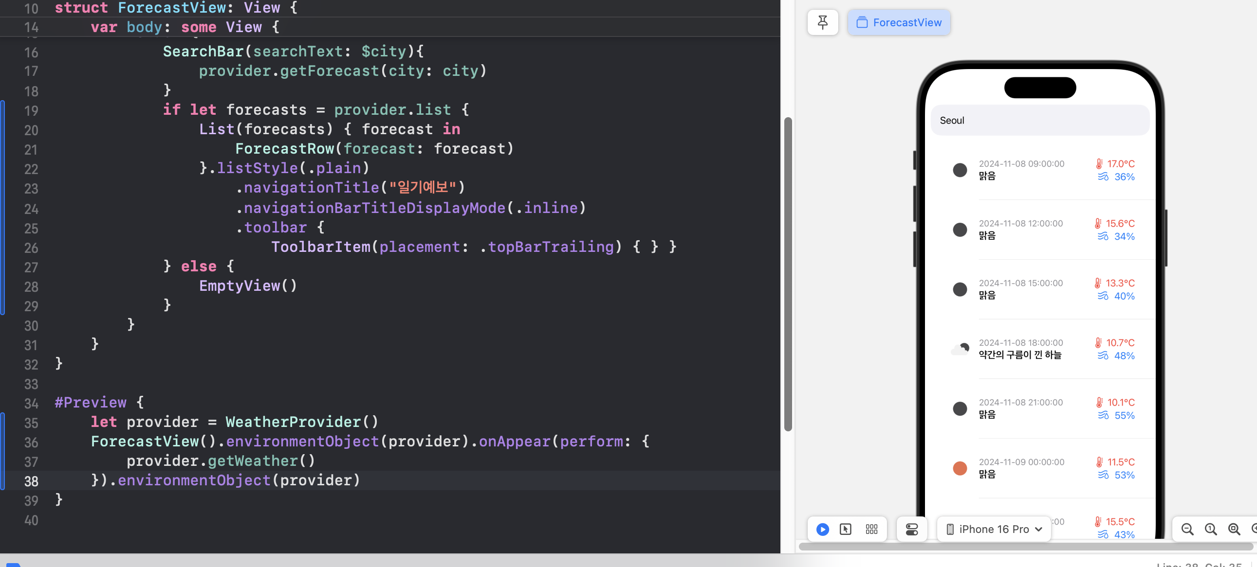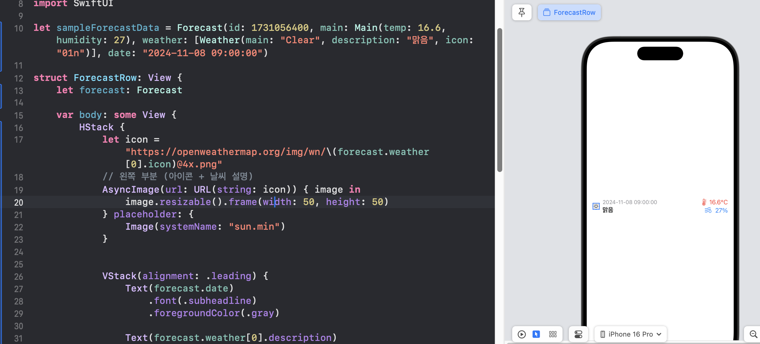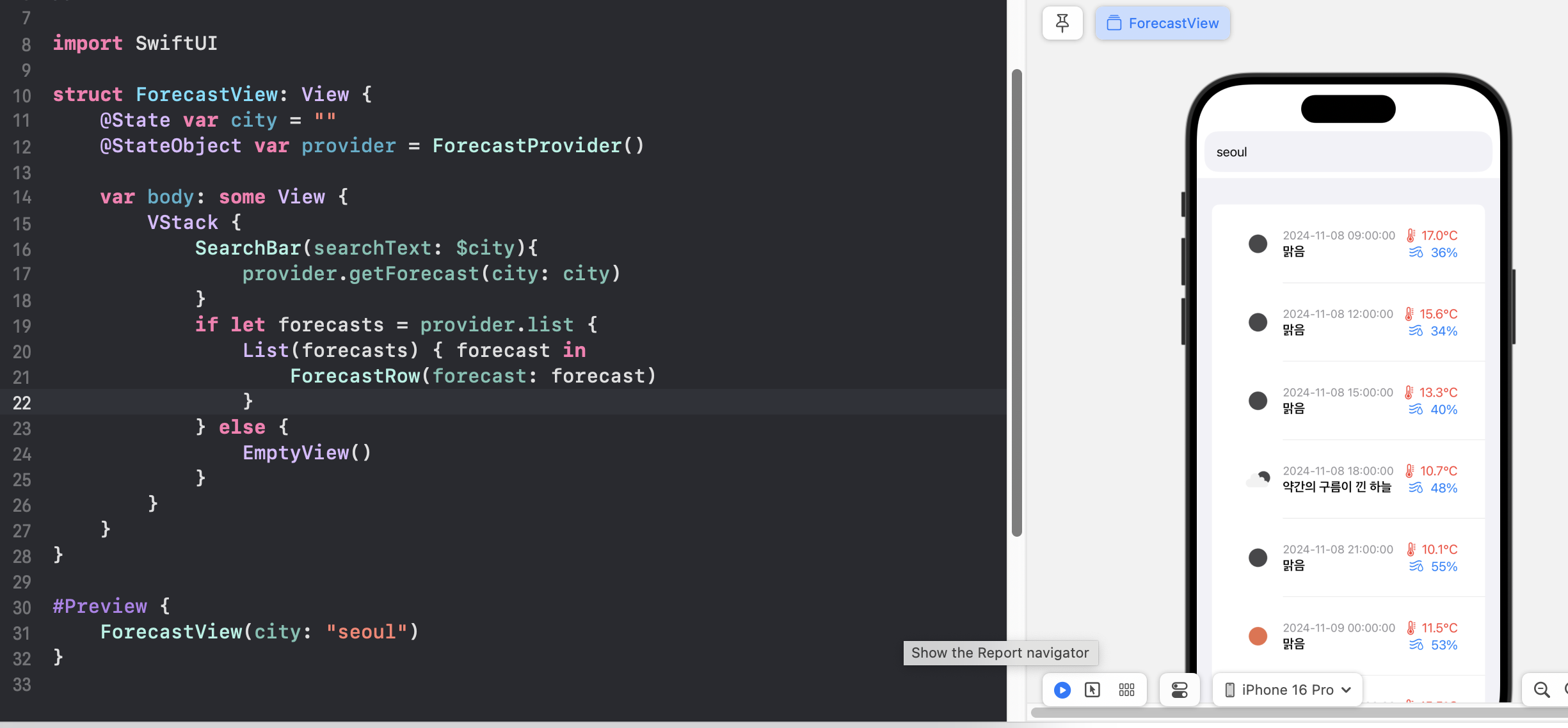 다시 돌아와서 ForecastView.swift에서 테스트해본다.