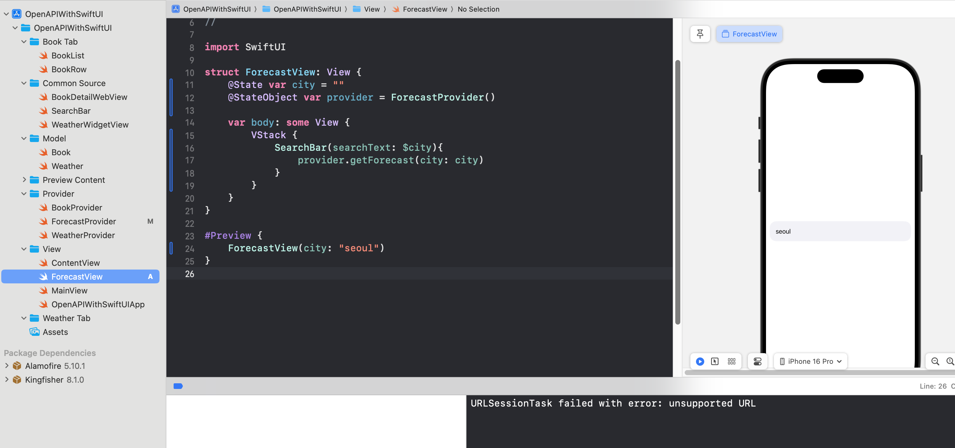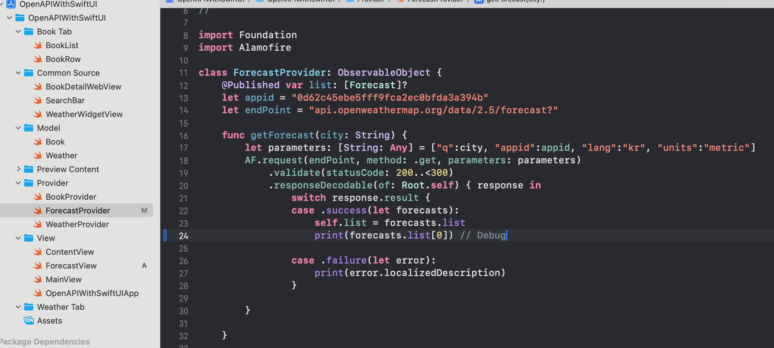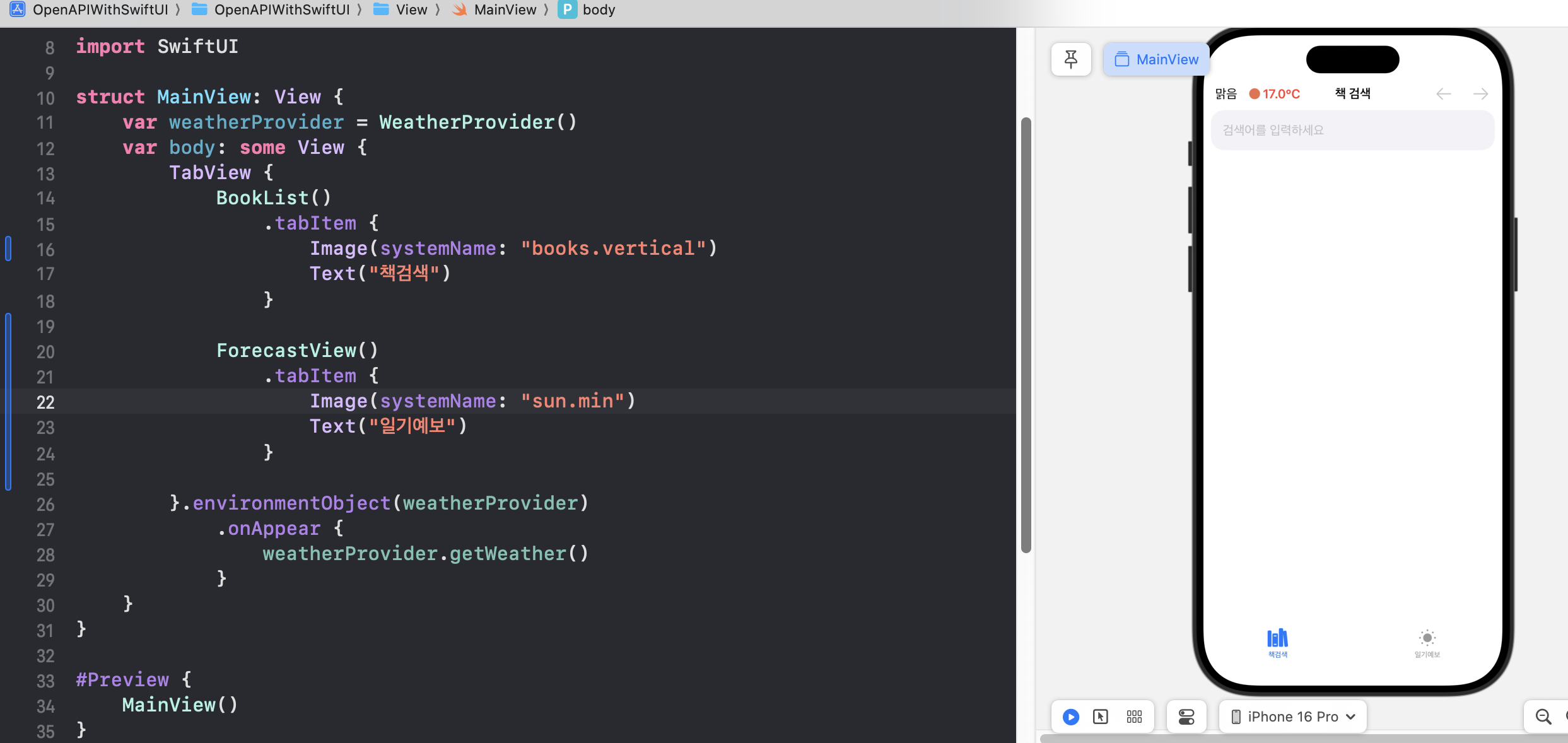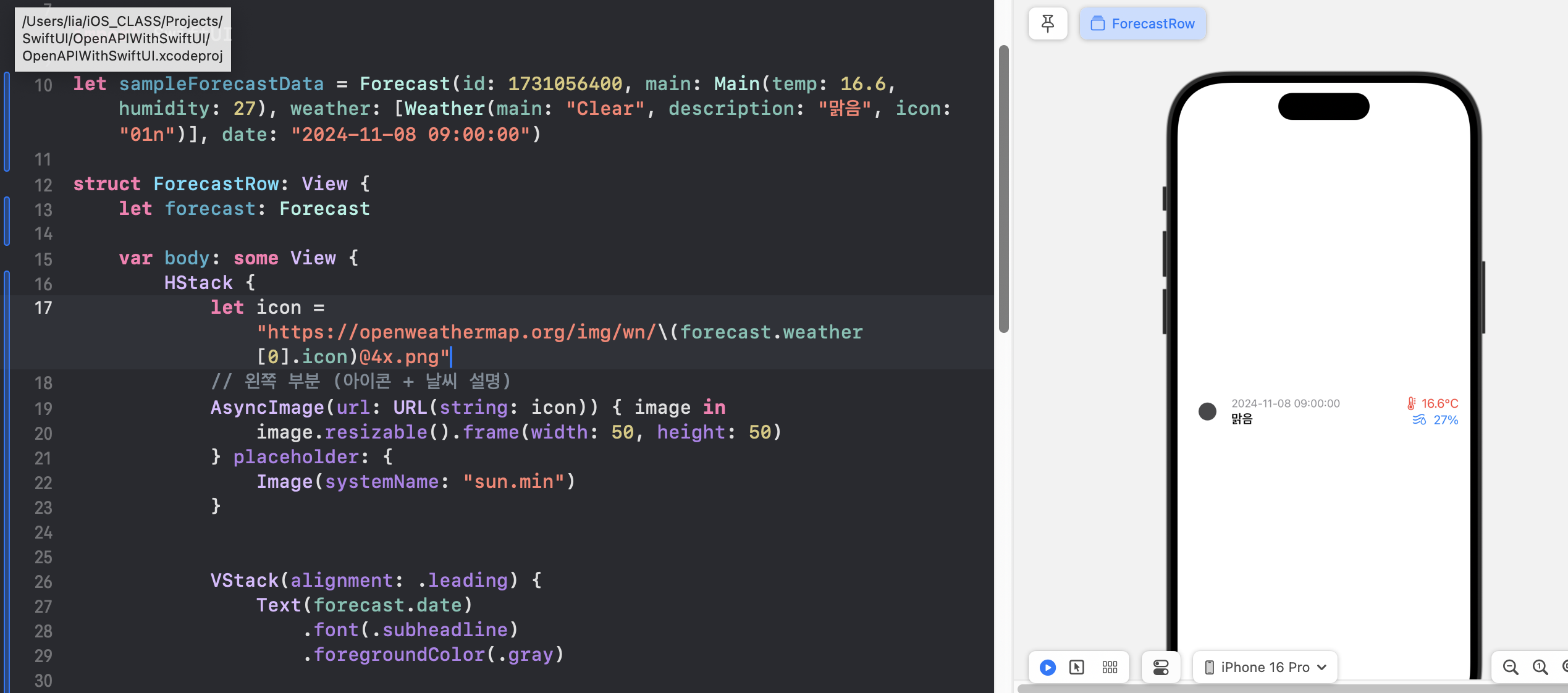 다시 돌아와서 ForecastView.swift에서 테스트해본다.