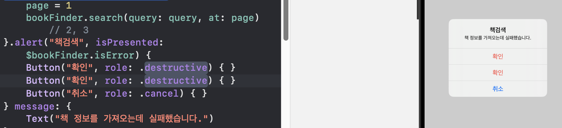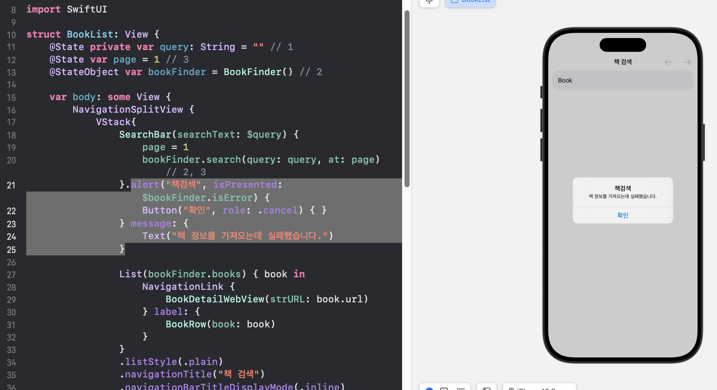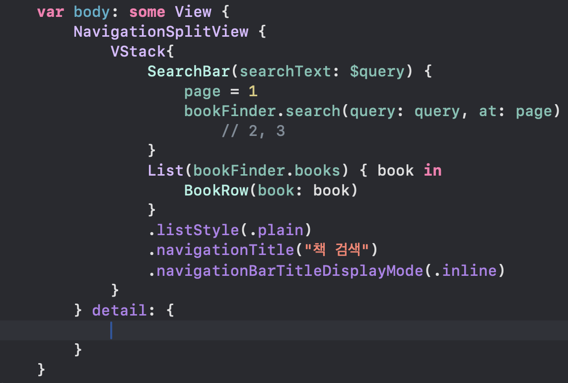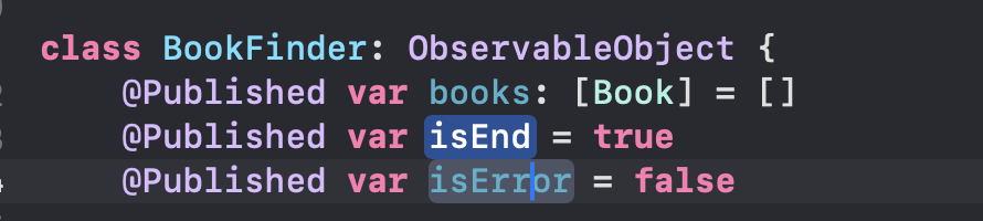 3) bookFinder.search함수는 page 인자가 필요하므로, 기본값을 넣어준다 (@StateObject)