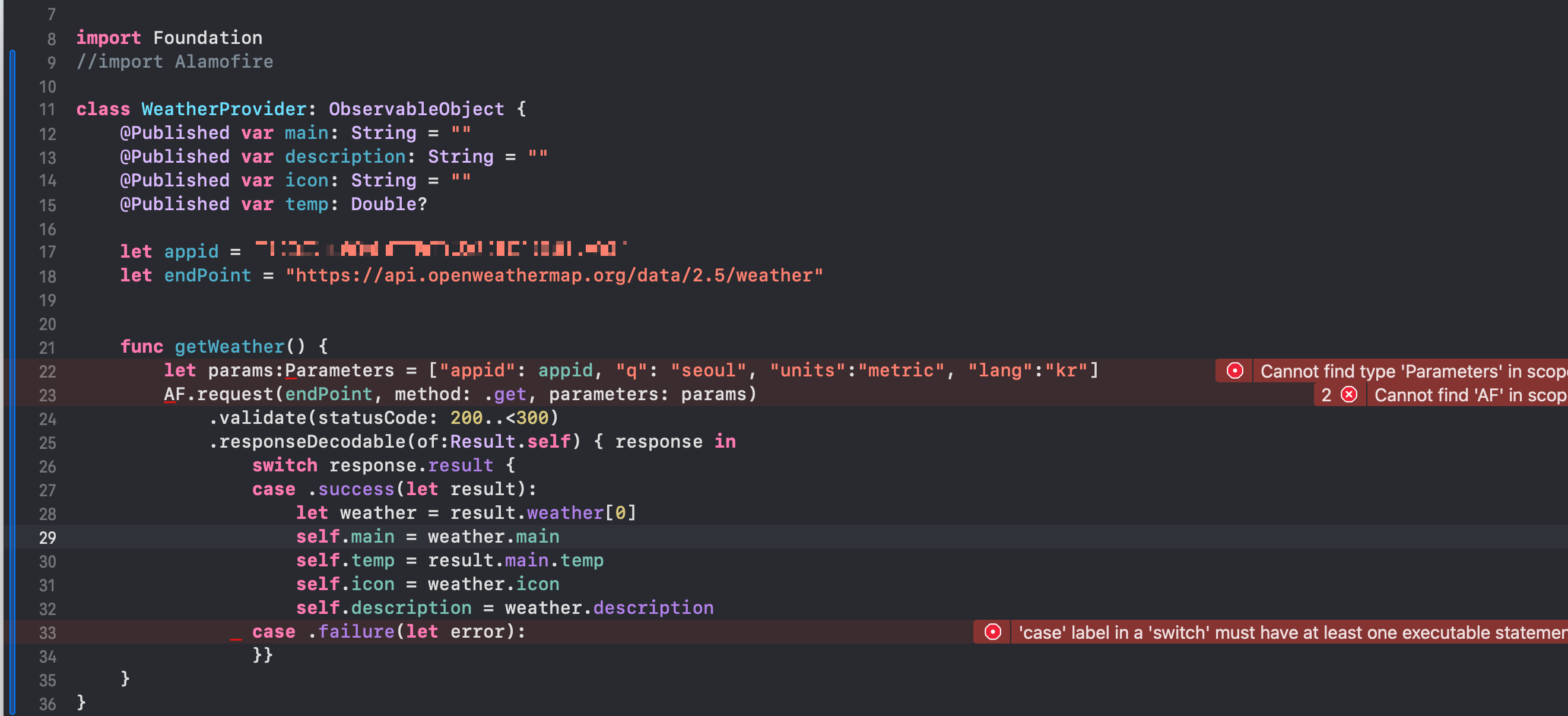 let parameters: [String: Any] = ["q":city, "appid":appid, "lang":"kr", "units":"metric"]