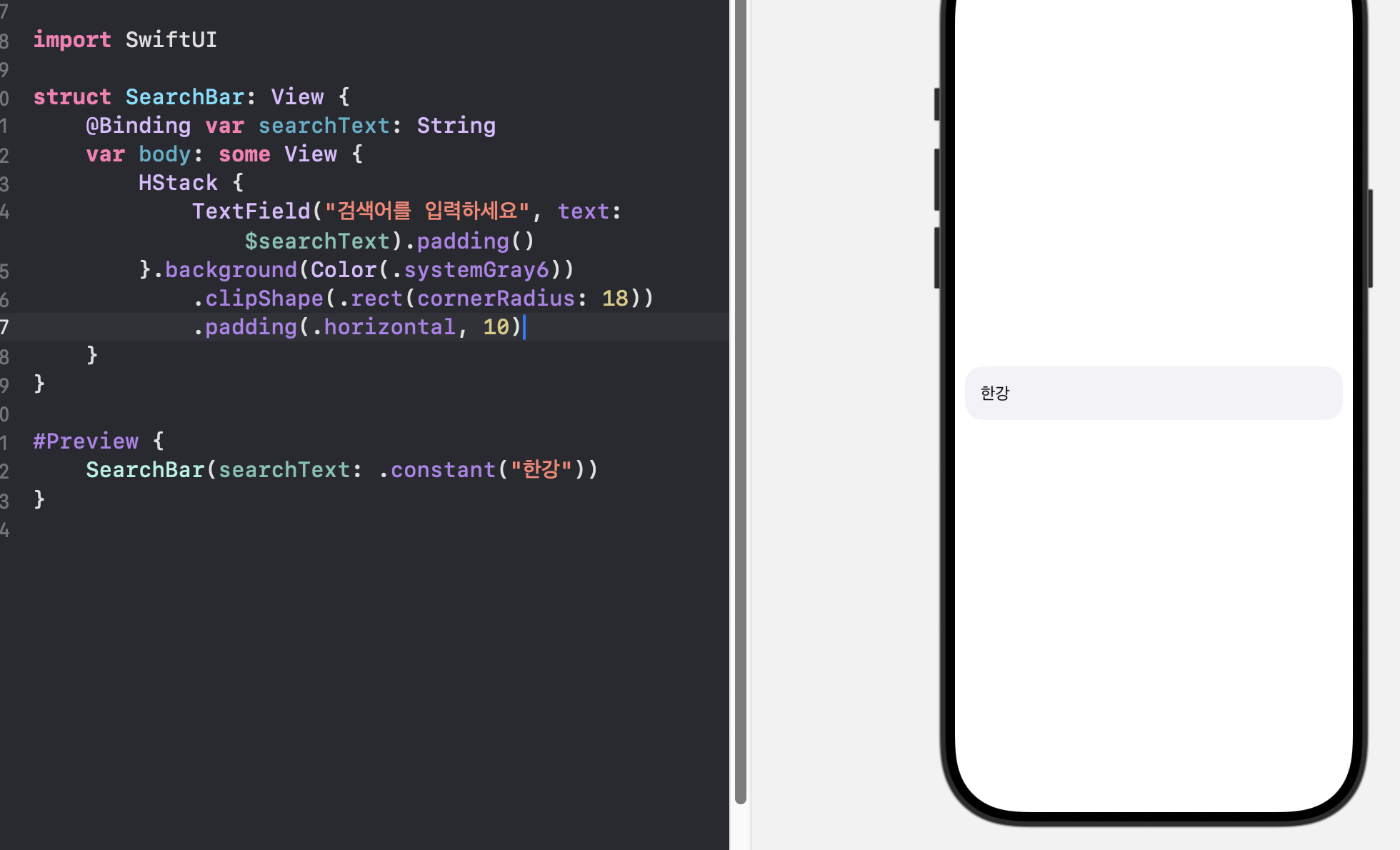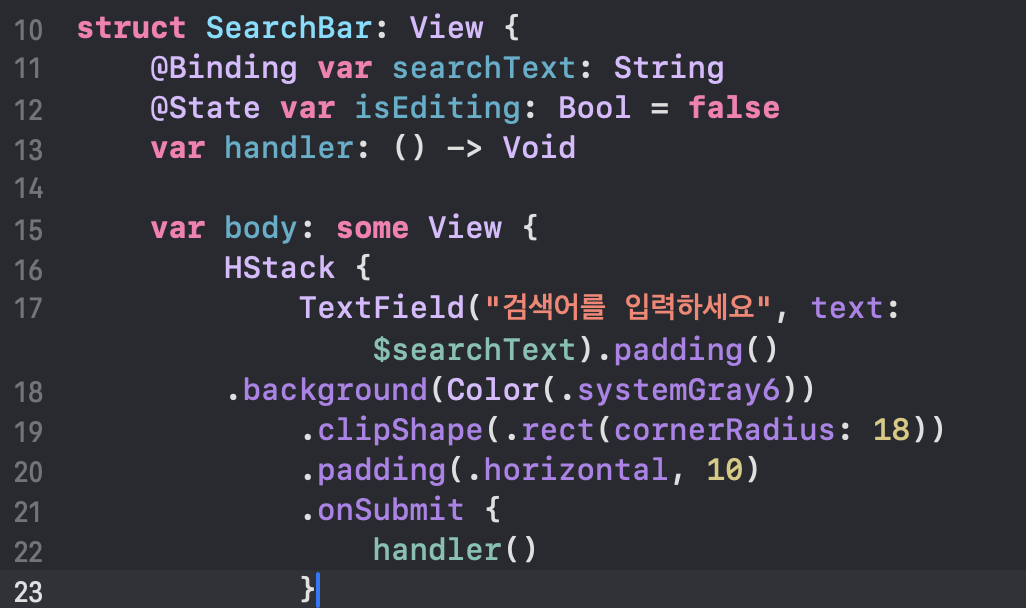 TextField("검색어를 입력하세요", text: $searchText).padding()