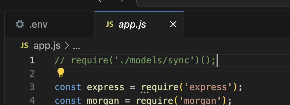 이 때, app.js에서 최초 1회는 주석 해제를 하고 데이터베이스를 돌린다.