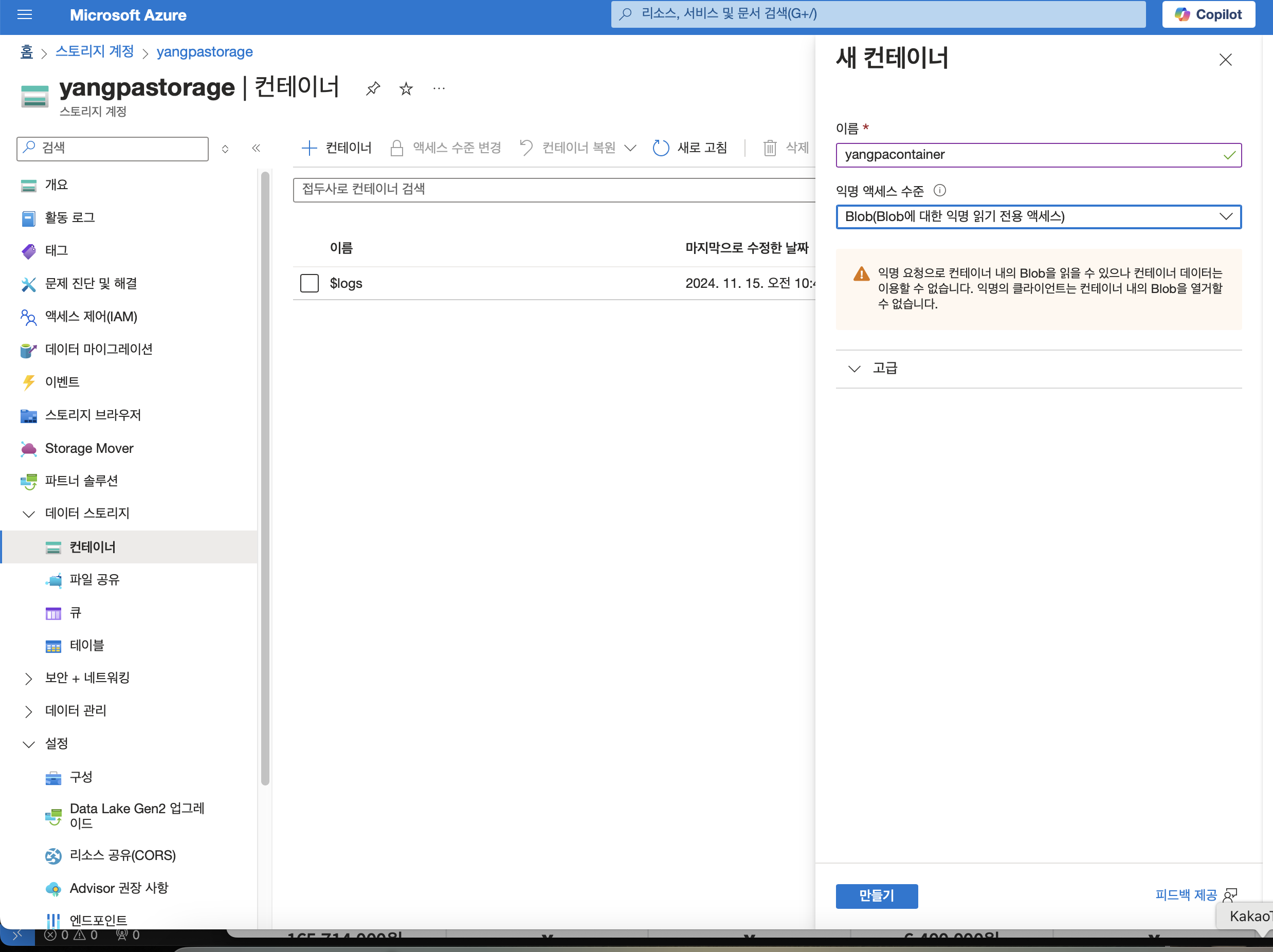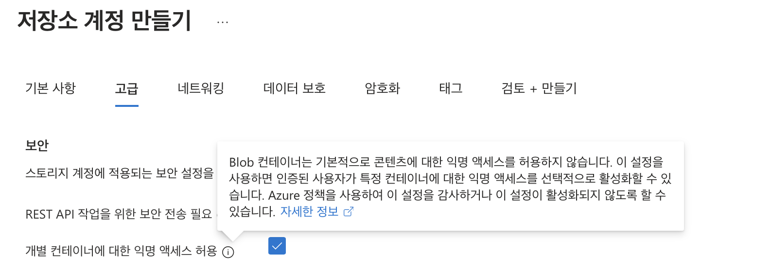 '고급' 단계에서 '개별 컨테이너에 대한 익명 액세스 허용' 체크!!!