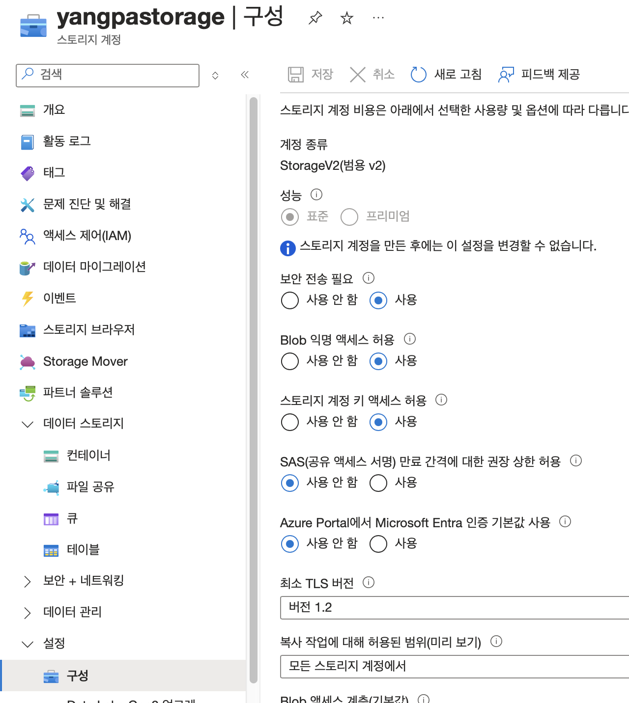 Blob 익명 액세스 허용 확인을 해준다.
