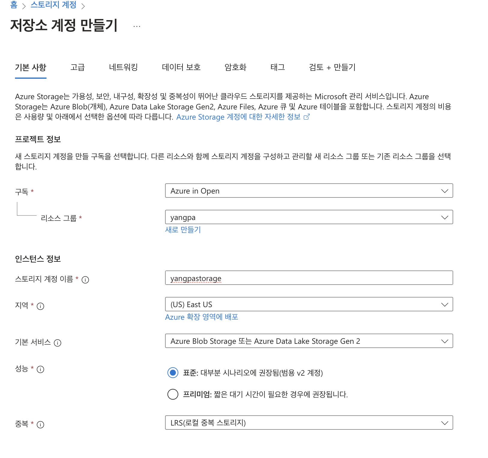 2. 그리고 배포를 기다리는동안 스토리지 계정 -> 저장소 계정 만들기를 해준다.