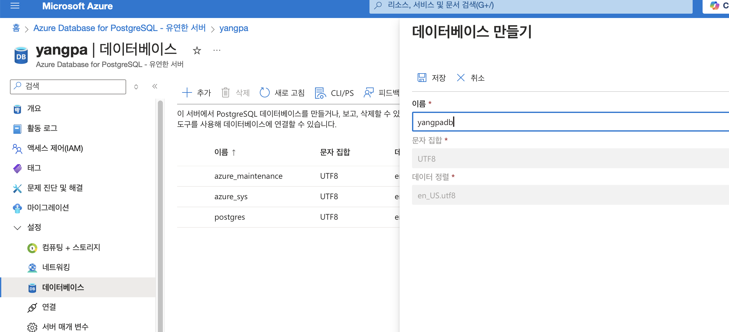 Azure 포털에서 리소스 DB 생성