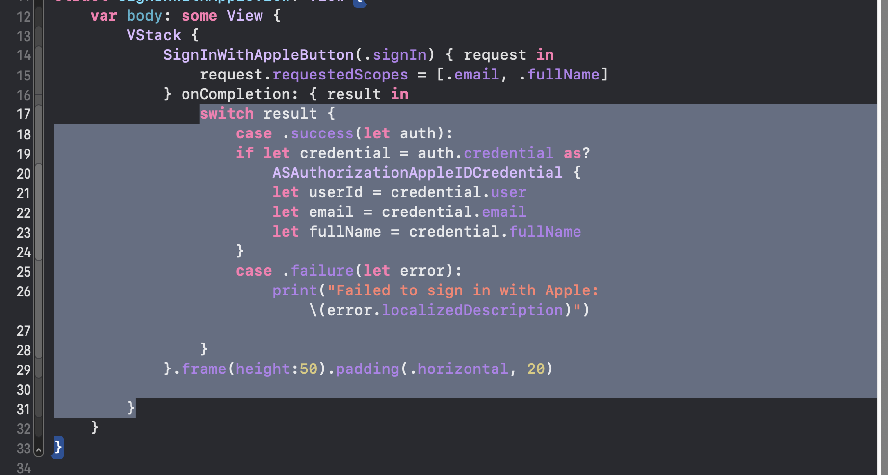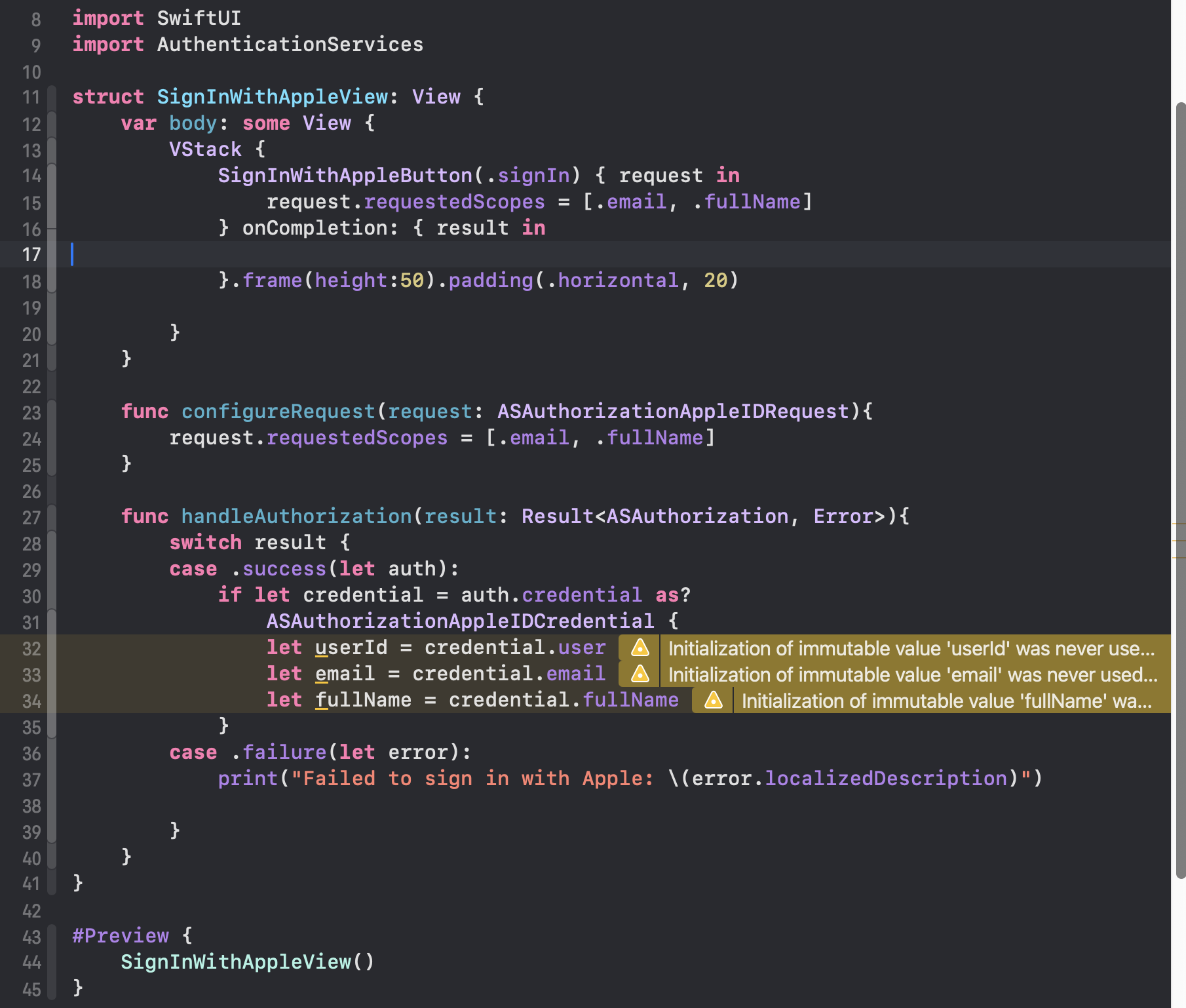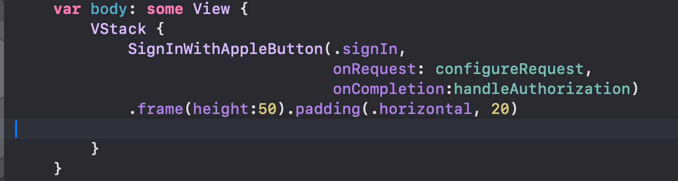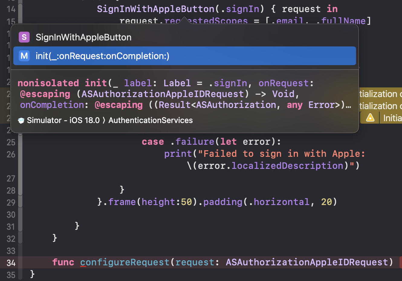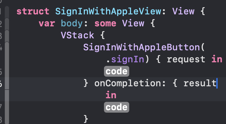 body View 컨테이너 아래에다가 함수를 만들어줄건데, request의 타입은 위 SignInWithAppleButton 메서드가 따르는 타입인 ASAuthrizationAppleIDRequest이기 때문에 그대로 해준다.