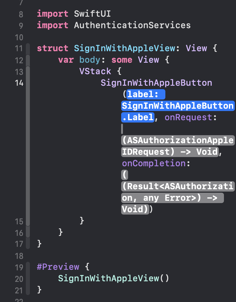 import 후에 아래 SignInWithAppleButton()메서드를 임포트해준다. (label 생성자가 있는걸로)
